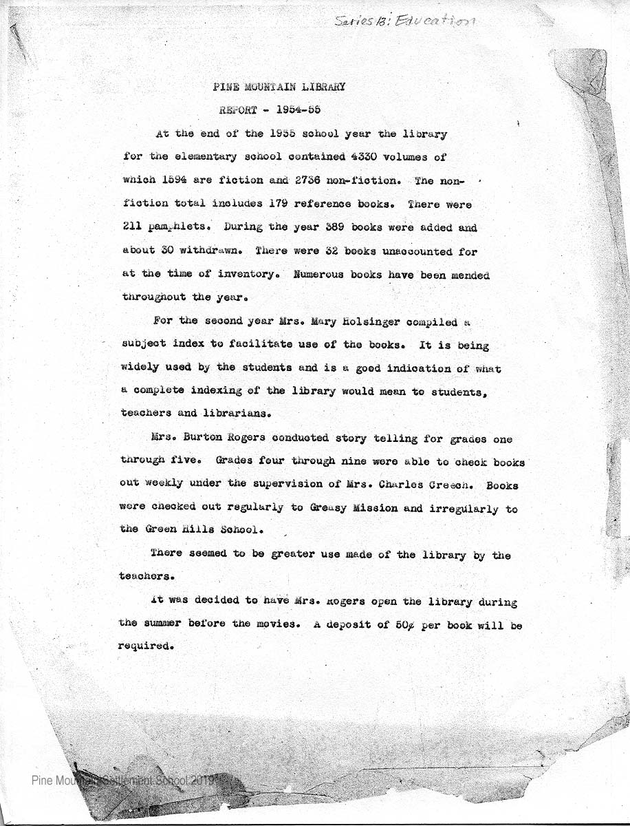 The Library Report of 1955-56 is a snapshot of the holdings and the activity of the Pine Mountain Settlement School Library during the Community School years when the collections were vital for the school operations. The report is by Mary Rogers, who was the librarian at the time and includes notes by Betty Edinger, School secretary at the time.