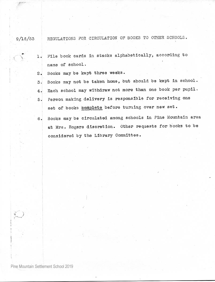- Books may be circulated among schools in Pine Mountain area at Mrs. Rogers’ discretion. Other requests for books to be considered by the Library Committee.
