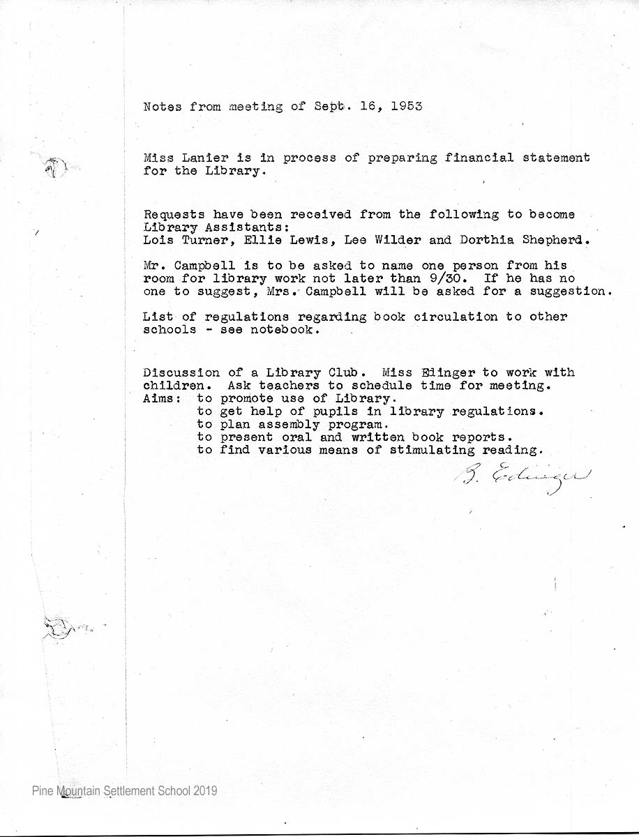 Discussion of a Library Club. Miss [Betty] Edinger to work with children. Ask teachers to schedule time for meeting.