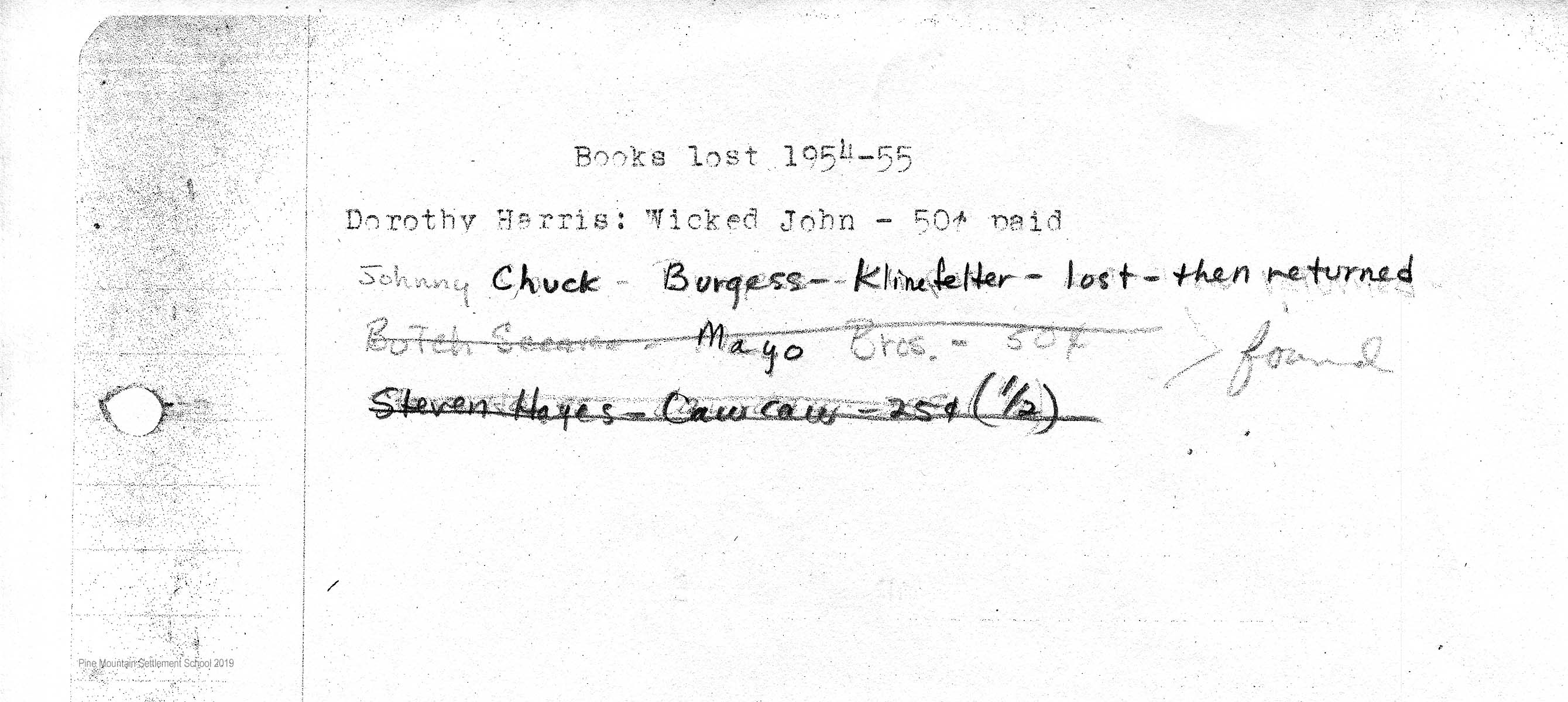 TAGS: 1955-56 Library Report Pine Mountain Settlement School Community Library, students, libraries, overdue fines, Betty Edinger, Mary Rogers