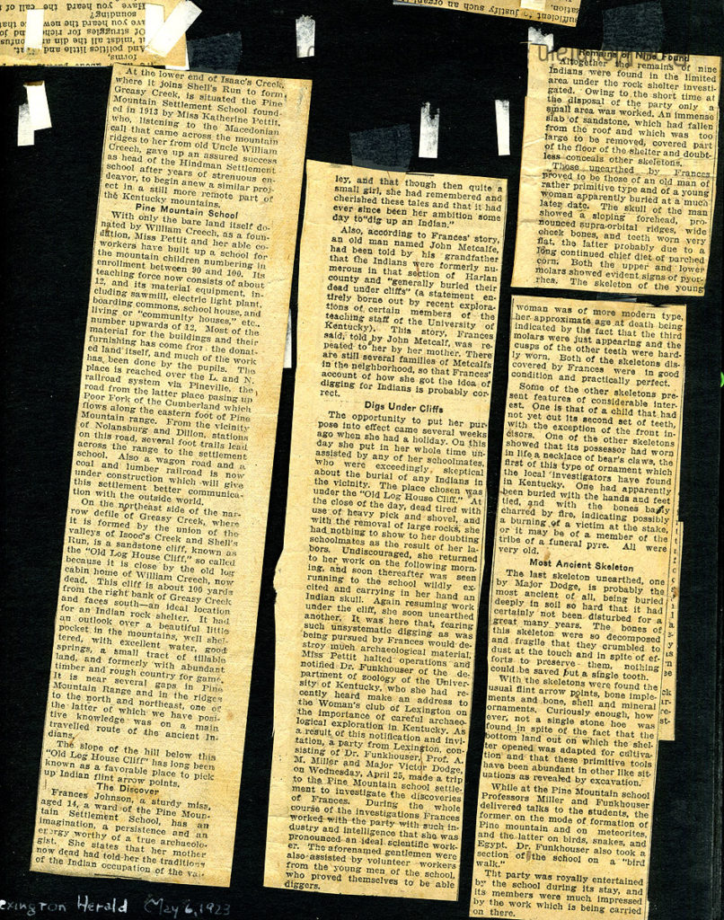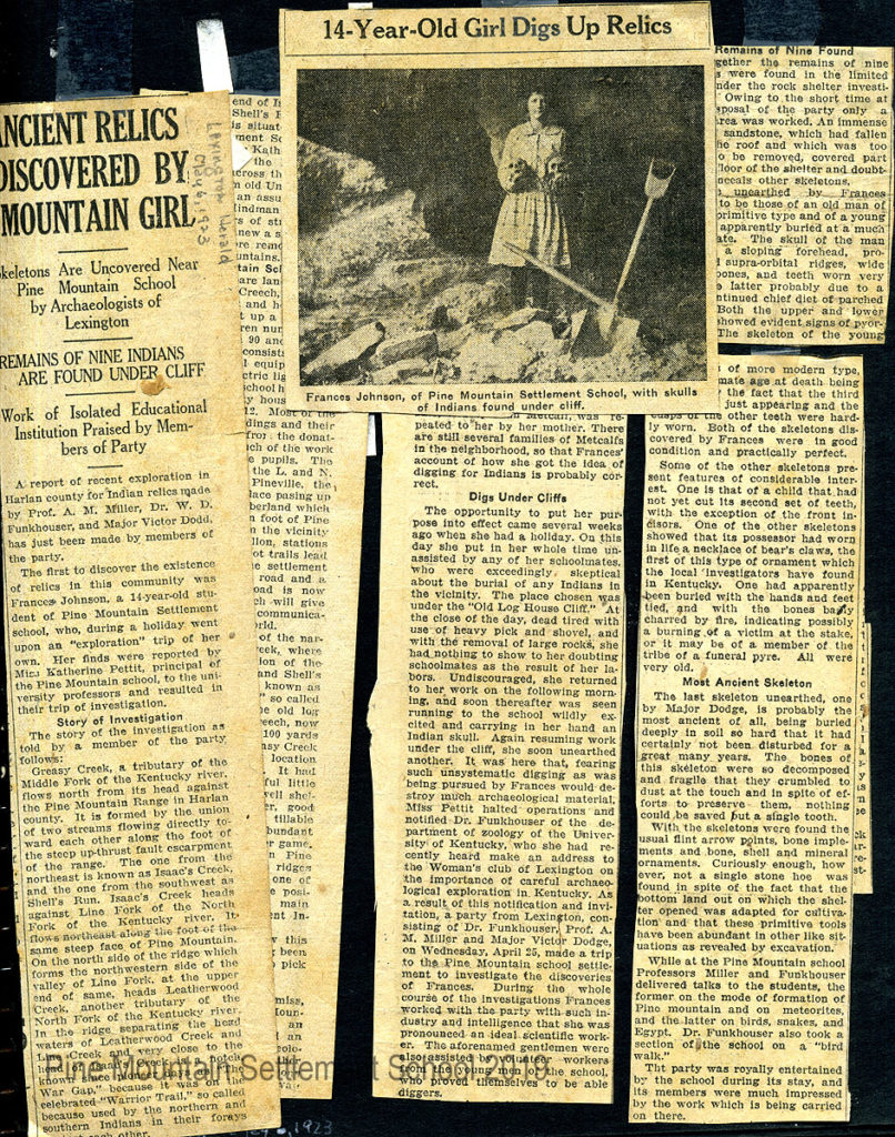 The following newspaper article in the Lexington Herald, May 6, 1923, details the discovery and subsequent excavation of the archaeological site under the so-called “INDIAN CLIFF” at Pine Mountain Settlement School in Harlan County, Kentucky. Frances Johnson, a 14-year-old student at Pine Mountain Settlement School, convinced that Indians must have lived under the shelter, was determined to show her fellow students that she knew about Indian dwellings. She diligently pursued her own exploration and soon unearthed the remains of humans beneath the cliff. Her over-zealous digging was quickly stopped by Katherine Pettit, the School’s Director, who knew of a professor of zoology, Dr. William D. Funkhouser, at the University of Kentucky. She sent for him after hearing his recent talk to the Women’s Club of Lexington advocating for responsible and careful archaeological exploration.