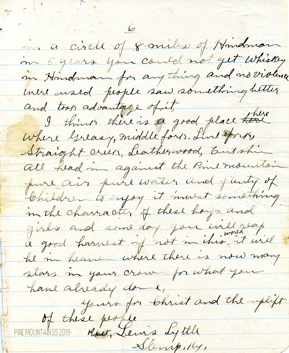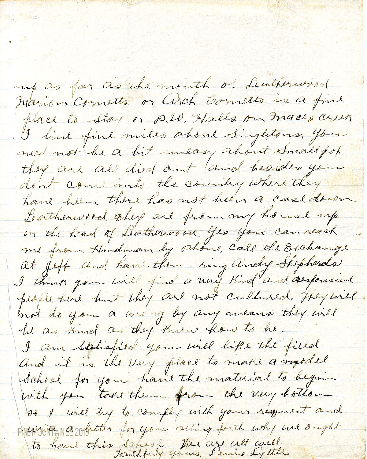 I think there is a good place here where Greasy, Middle Fork, Line Fork, Straight Creek, Leatherwood, Cutshin, all head in against the Pine Mountain. Pure air, pure water and plenty of children to enjoy it. Invest something in the character of these boys and girls and someday you will reap a good harvest, if not in this world it will be in heaven where there is (sic) now many stars in your crown for what you have already done.