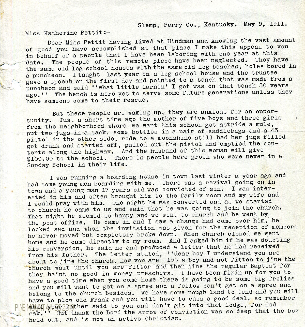 Dear Miss Pettit: Having been connected some with your work at [penciled notation: lived at] Hindman and knowing the vast amount of good you have accomplished at that place, I make this appeal to you in behal[f] of a people that I have been laboring with one year at this date.
