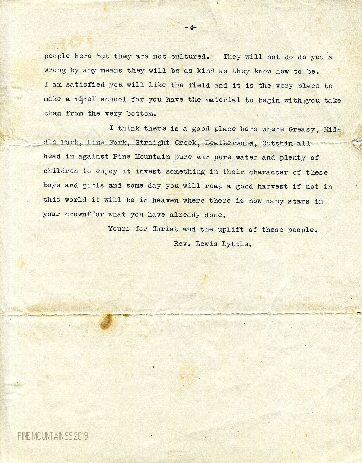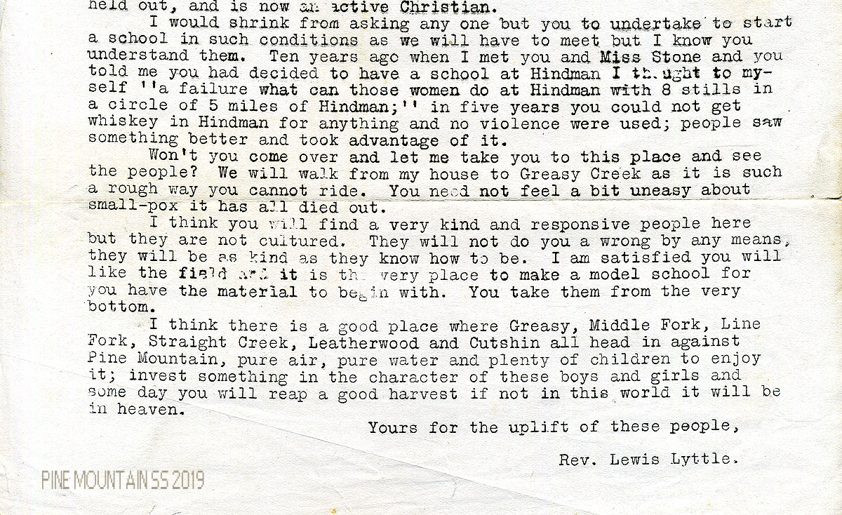 In the early 1900s, Rev. Lewis Lyttle served as a liaison between Katherine Pettit and the community to find those who would donate suitable land on which to build a new settlement school. When Lyttle wrote the following letters, the idea of a school in the Pine Mountain Valley was just beginning to form in the minds of Lyttle and Pettit. The timing was fortuitous and both Lyttle and Pettit began to energetically work toward making the vision a reality.