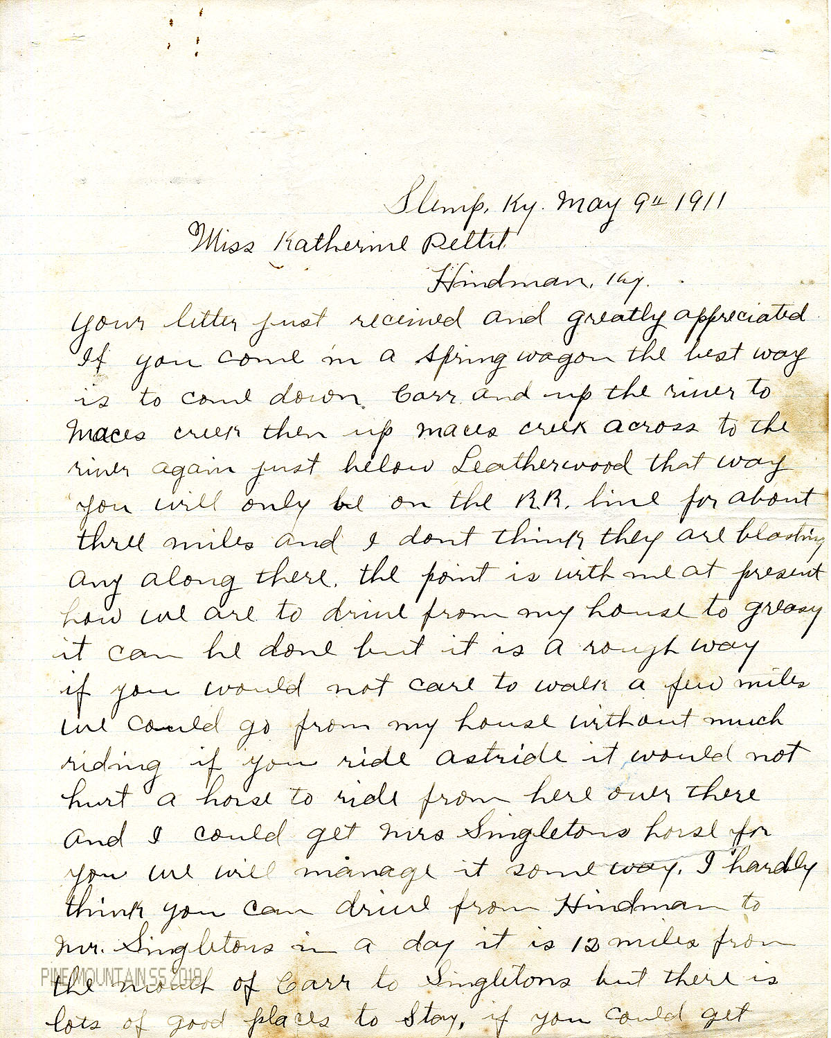 When you come [by] horseback, come to Mr. Hilton’s on Carr [Fork] at the mouth of Breedings Creek, then come up Defeated Creek that comes in at Mr. Hilton’s. You then come down the river about 2 miles to Leatherwood, then come up Leatherwood 5 miles to Henry Singleton’s. You then can call for me over the phone and I will give you further directions or you may come direct to my house. You can come from Hindman to Mr. Singleton’s in a day. Have Amos Bryant to come with you: he knows the way and he wants to come over here in [on?] some S.S. works.