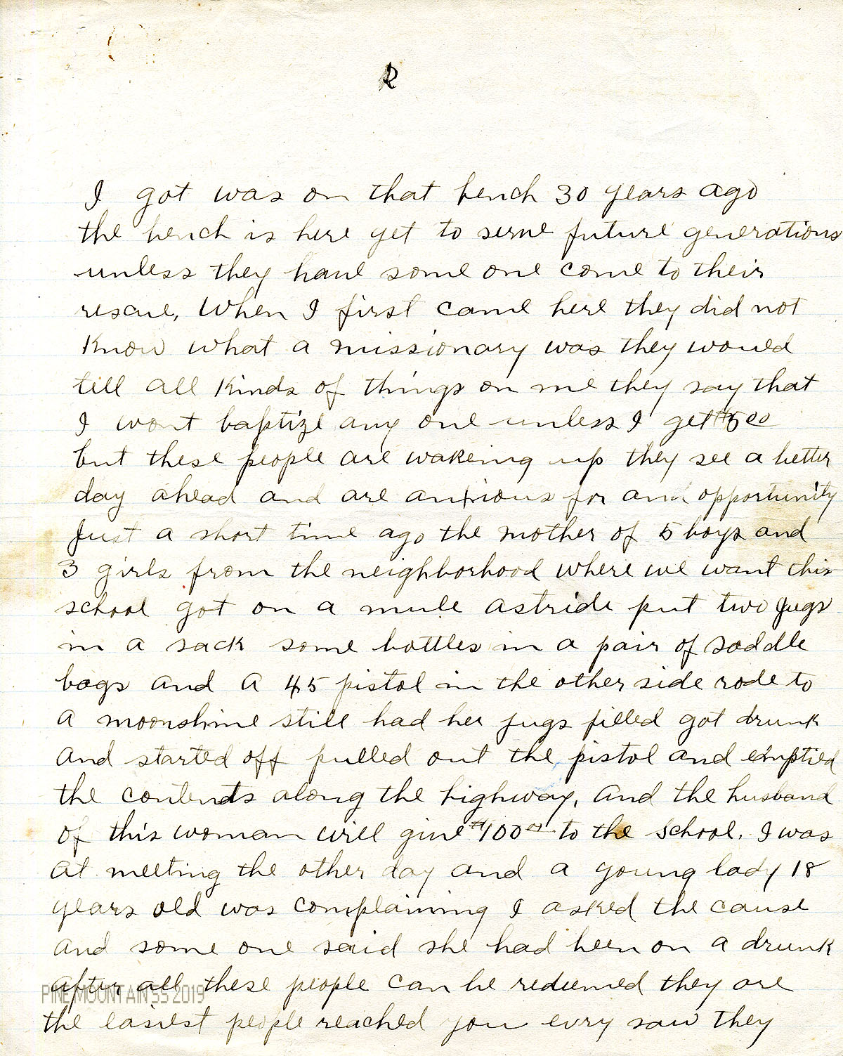 Just a short time ago the mother of 5 boys and 3 girls from the neighborhood where we want this School got on a mule astride, put two jugs in a sack, some bottles in a pair of saddle bags and a 45 pistol in the other side, rode to a moonshine still, had her jugs filled, got drunk and started off, pulled out the pistol and emptied the contents along the highway. And the husband of this woman will give $100.00 to the School.