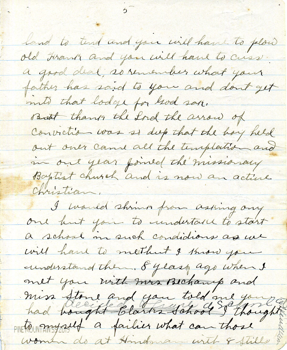 I would shrink from asking anyone but you to undertake to start a School in such conditions as we will have to meet but I know you understand them. 8 [change to “ten” in transcription] years ago when I met you with Mrs. Dechamp and Miss Stone and you told me you bought Clarks School [penciled notation: had decided to have a school at Hindman,] I thought to myself , “A failure. What can those women do at Hindman with 8 stills…
