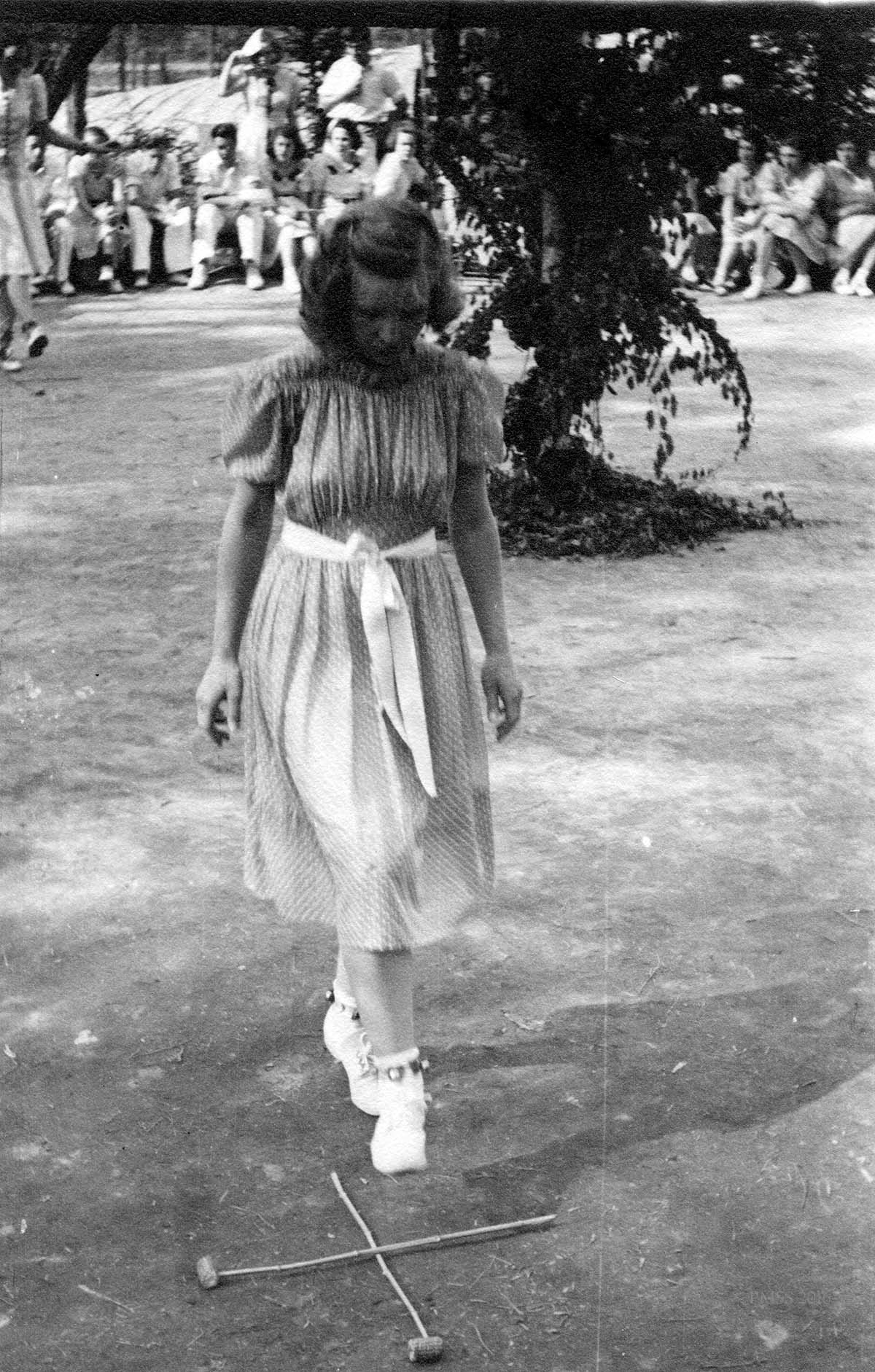 It was at Berea that Lucille met her future husband, George Wesley McKinney Jr. The story is told that George, born in Amigo, West Virginia, had his eye on Lucille even before he enrolled in Berea. Lucille had traveled to West Virginia to perform with a Pine Mountain group of dancers and balladeers and George, as he tells it, was charmed. Lucille had been chosen to execute a complicated folk dance for the visiting group, called “Baca Pipes” in which the dancer negotiates two long pipes placed on the ground in the form of a cross. Using a nimble series of jig steps the dancer tries to not disturb the pipes by her dance steps. The illustration below may, in fact, be Lucille performing at May Day at Pine Mountain in the late 1930s.