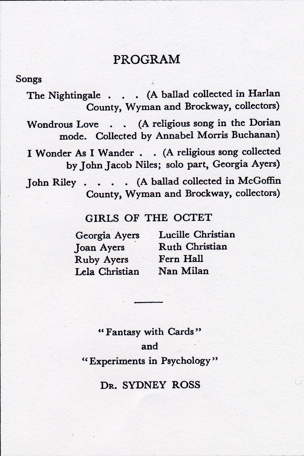 A major factor in the Pine Mountain Settlement School efforts to gain publicity and funding were two tours by the Pine Mountain Octet. The first was in November 1936, and involved twenty-two engagements including Kansas City, Indianapolis, St. Louis, Chicago, and Pittsburgh, as well as a performance at Mr. and Mrs. Henry Ford’s regular Friday night country dance party held in the research building of the Ford Motor Company. The Indianapolis Times stated, “There is something uncanny in listening to eight flaxen-haired mountain girls from Kentucky singing music, though it belongs to their lives today, which traces its origin back into the mists of antiquity… None of the troupe is older than twenty. Yet they have the poise of persons much older.”