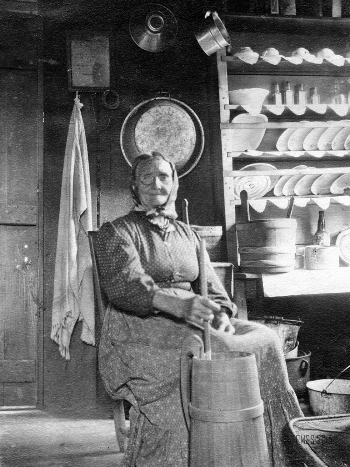- 016b P. Roettinger Album. “Aunt Sal.” [Seated with butter churner in her kitchen.] [ [roe_017a.jpg]