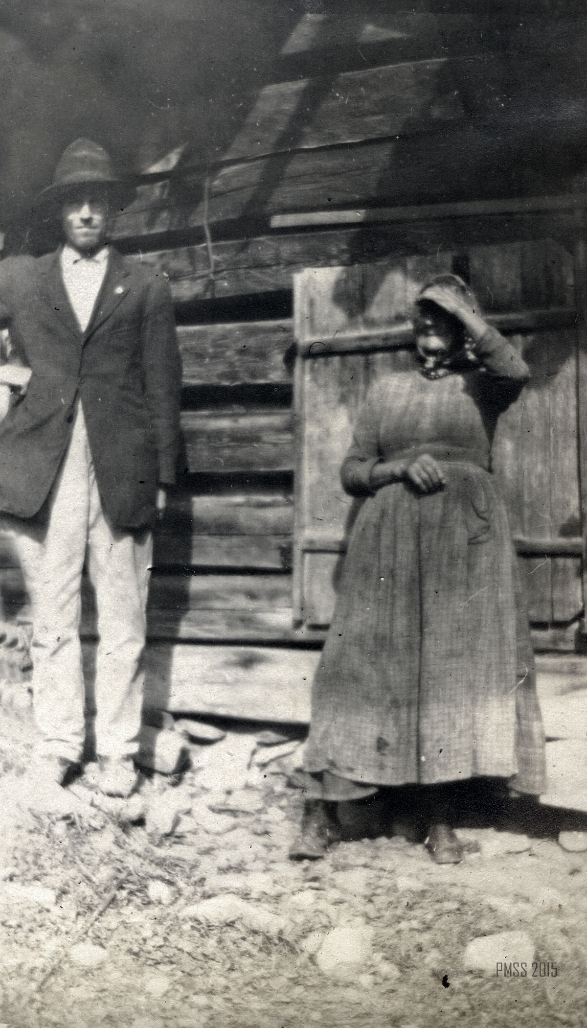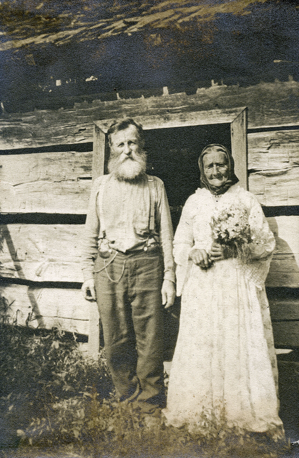 Aunt Sal and Uncle William Creech, in front of their original cabin, celebrating their golden wedding anniversary, 1916. [pmss00019.jpg]