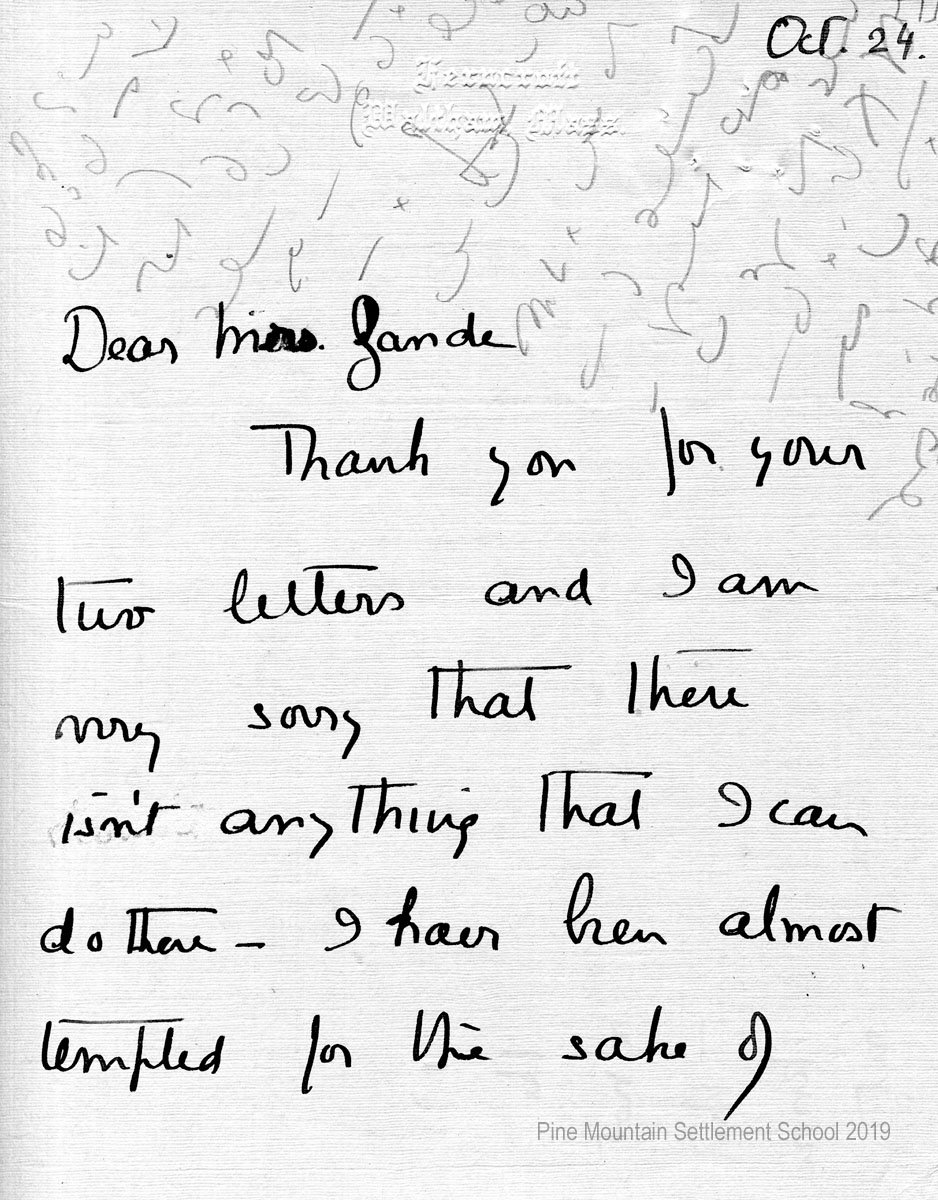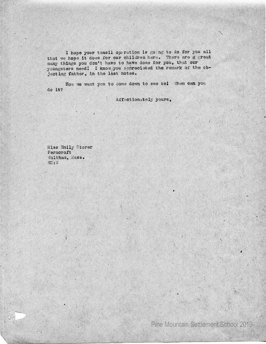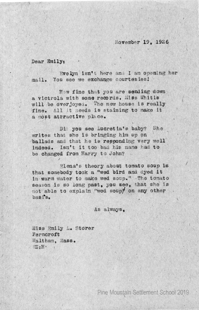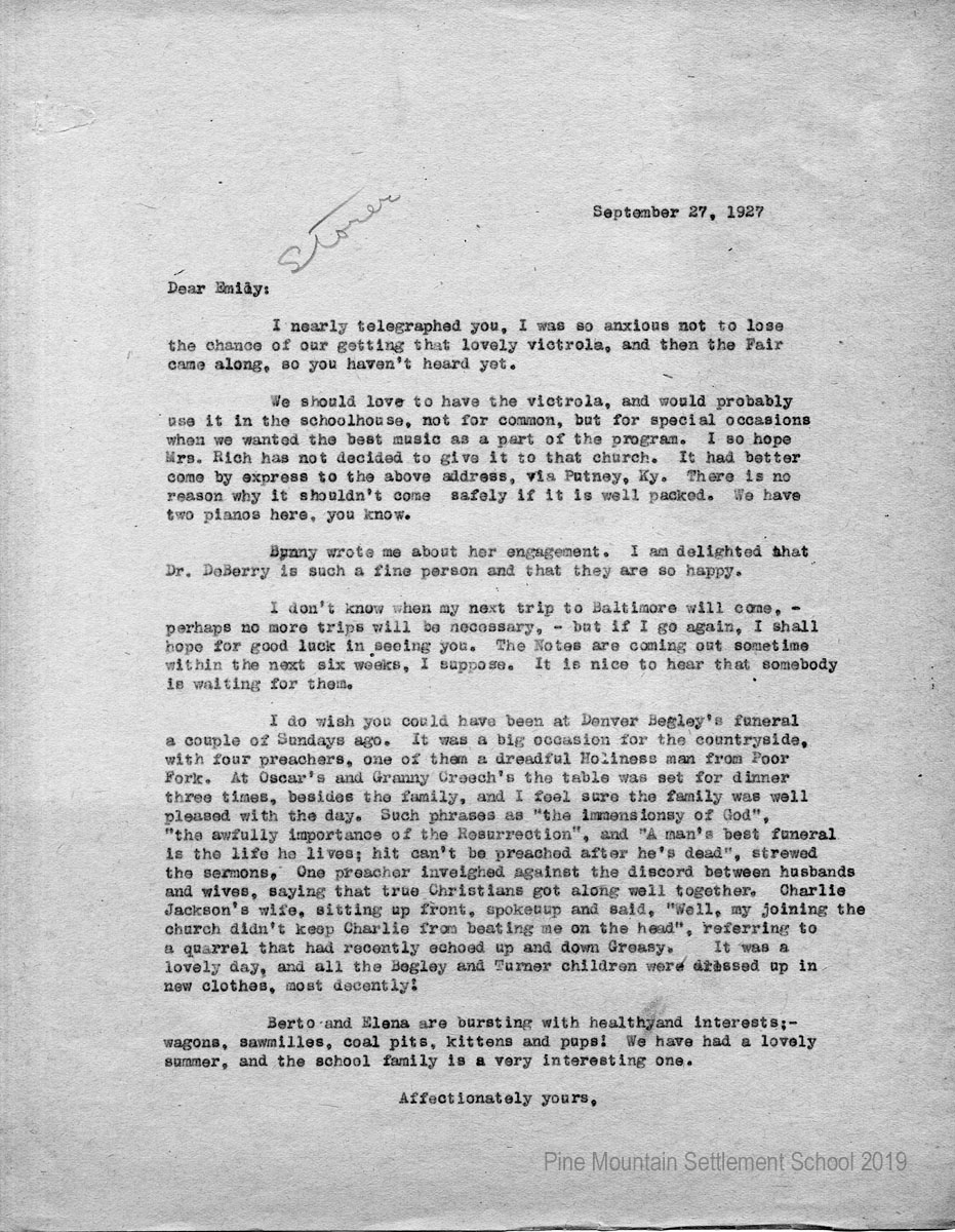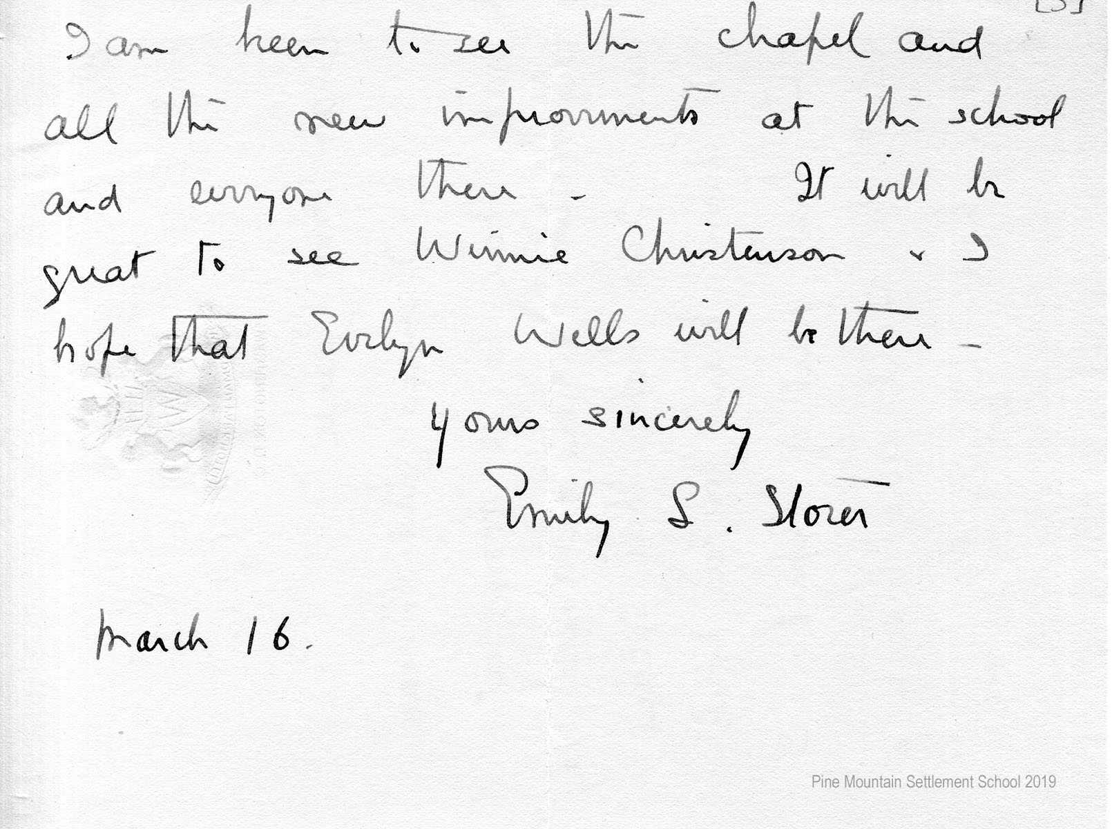 Eager for the Victrola; “Music means more and more to the children, as so many of them are taking piano lessons now, and learning to listen to it intelligently”; checked with Dr. Withington about a job for Storer’s niece; Kay Wright is at PMSS for three months. Updates concerning Big Laurel; young people are drifting back; Dan and Martha Turner are living near Incline.