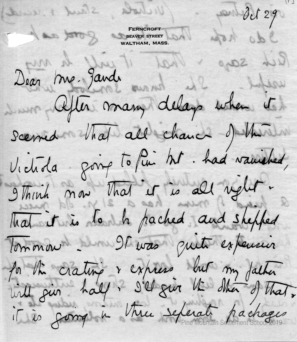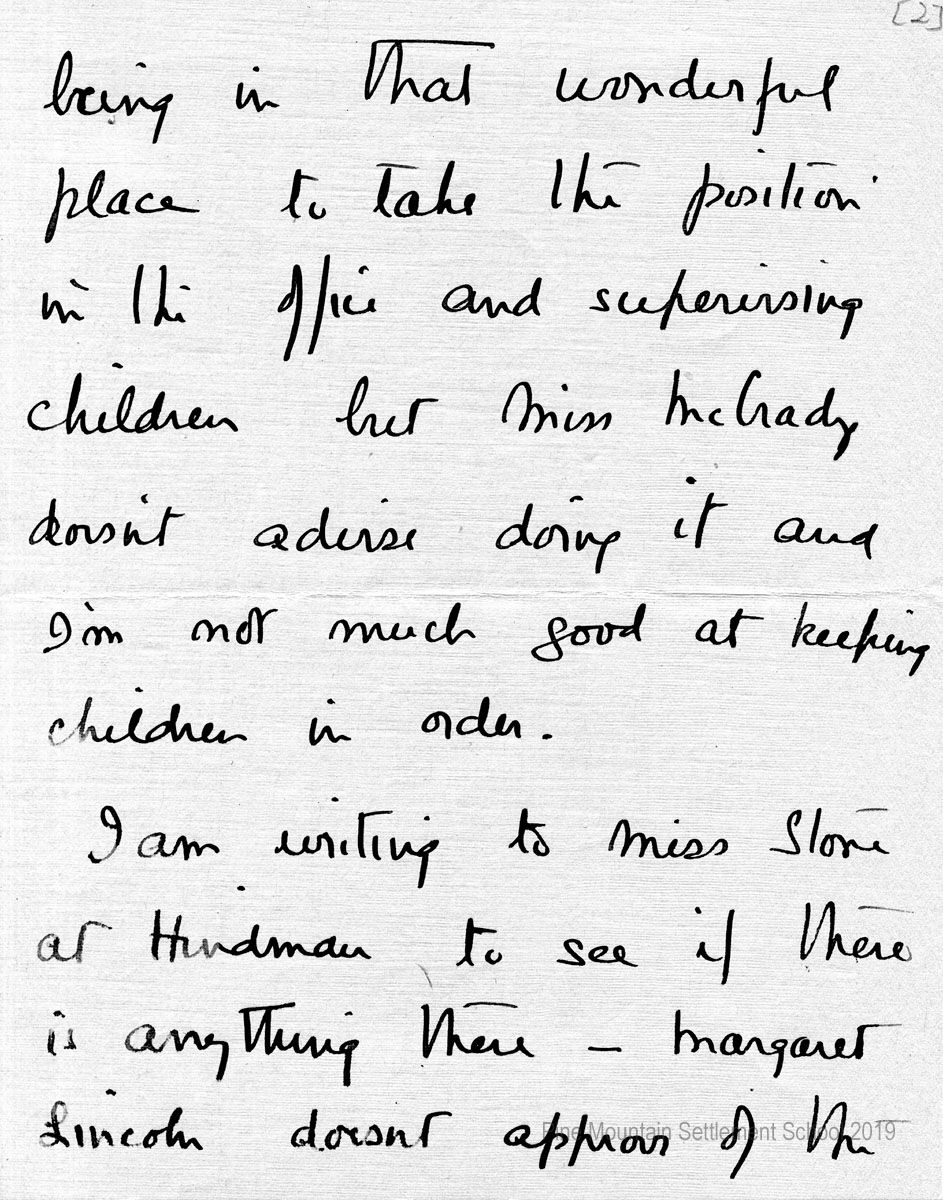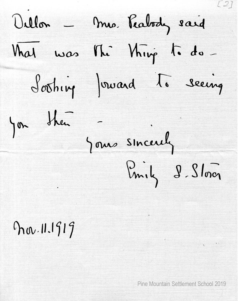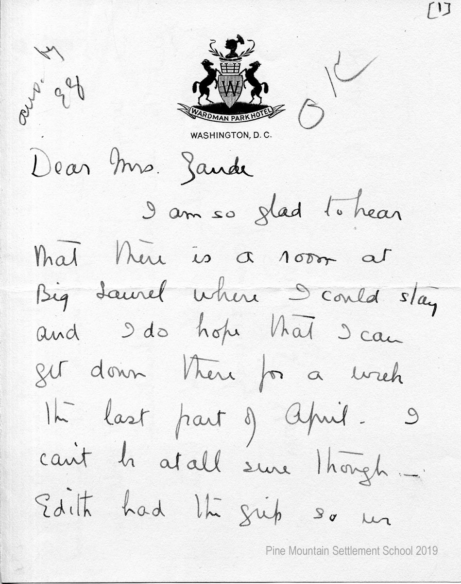 Eager for the Victrola; “Music means more and more to the children, as so many of them are taking piano lessons now, and learning to listen to it intelligently”; checked with Dr. Withington about a job for Storer’s niece; Kay Wright is at PMSS for three months. Updates concerning Big Laurel; young people are drifting back; Dan and Martha Turner are living near Incline.