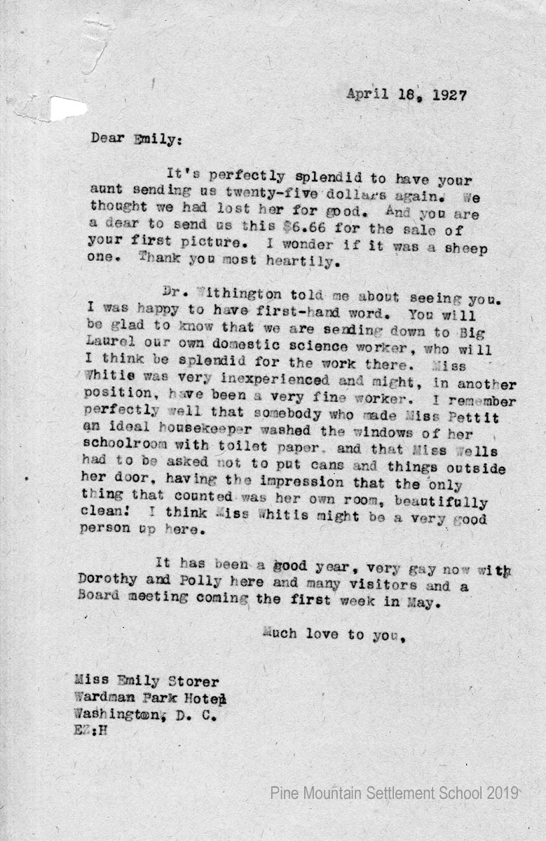 Appreciates $25 from Storer’s aunt and $6.66 for sale of Storer’s first picture. Mentions Dr. Withington; sending “our own” domestic science worker to Big Laurel, replacing Miss Whitis; Miss Wells; Dorothy and Polly.