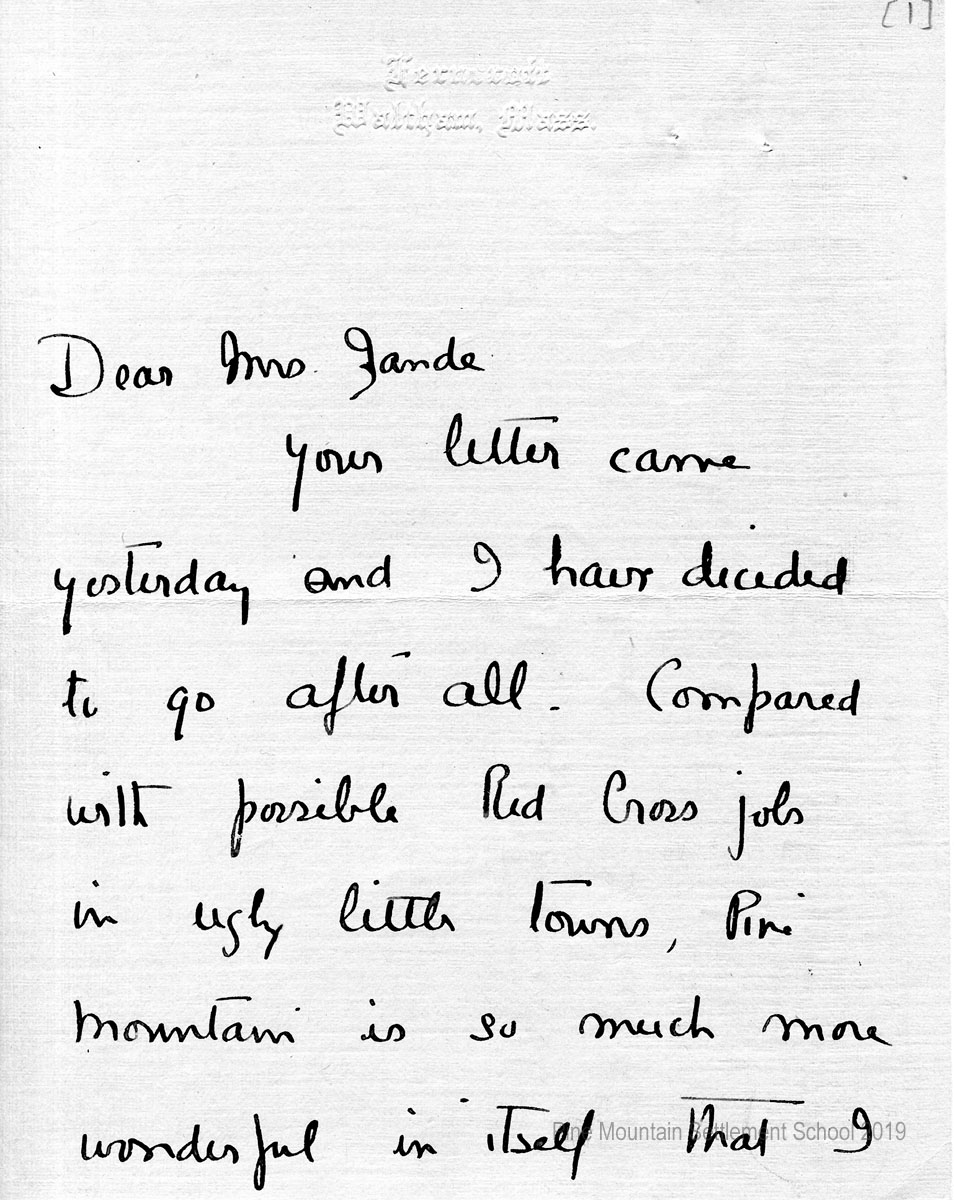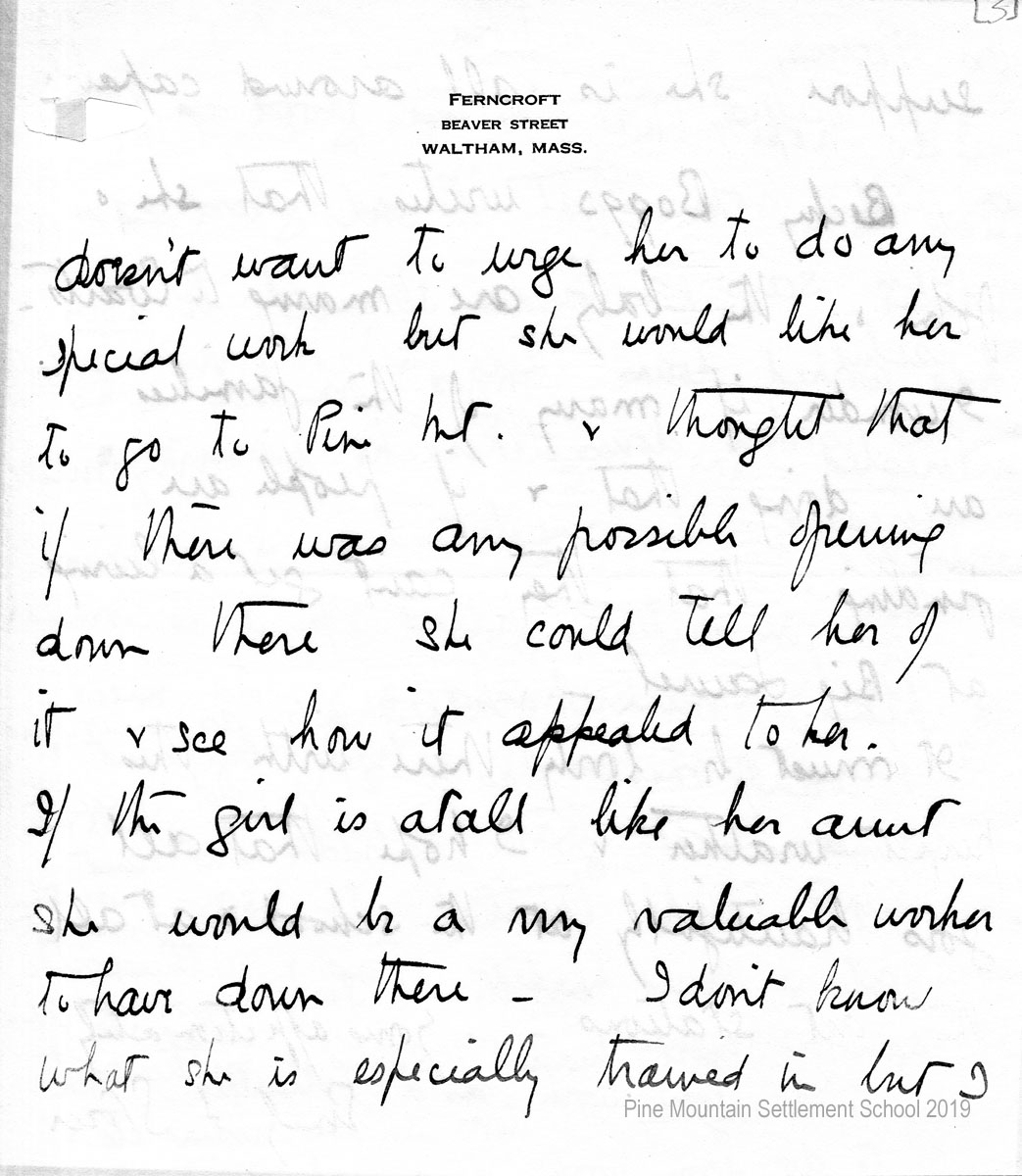 The back-and-forth of the application letters provides a good window on the many accommodations that were negotiated by Pine Mountain and applicants for PMSS positions. The letters from Ethel de Long Zande to Emily Storer often describe the concerns and daily activities at the School and in the community.