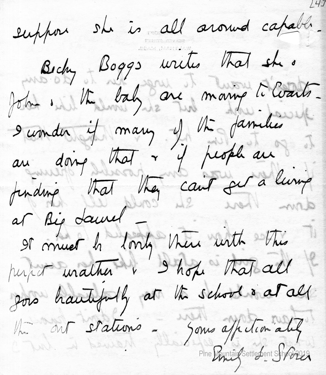 Update on sending Victrola via Putney; asked about a PMSS job for her niece; Becky Boggs and John are moving to Everts. “I wonder if many of the families are doing that and if people are finding that they can’t get a living at Big Laurel.”