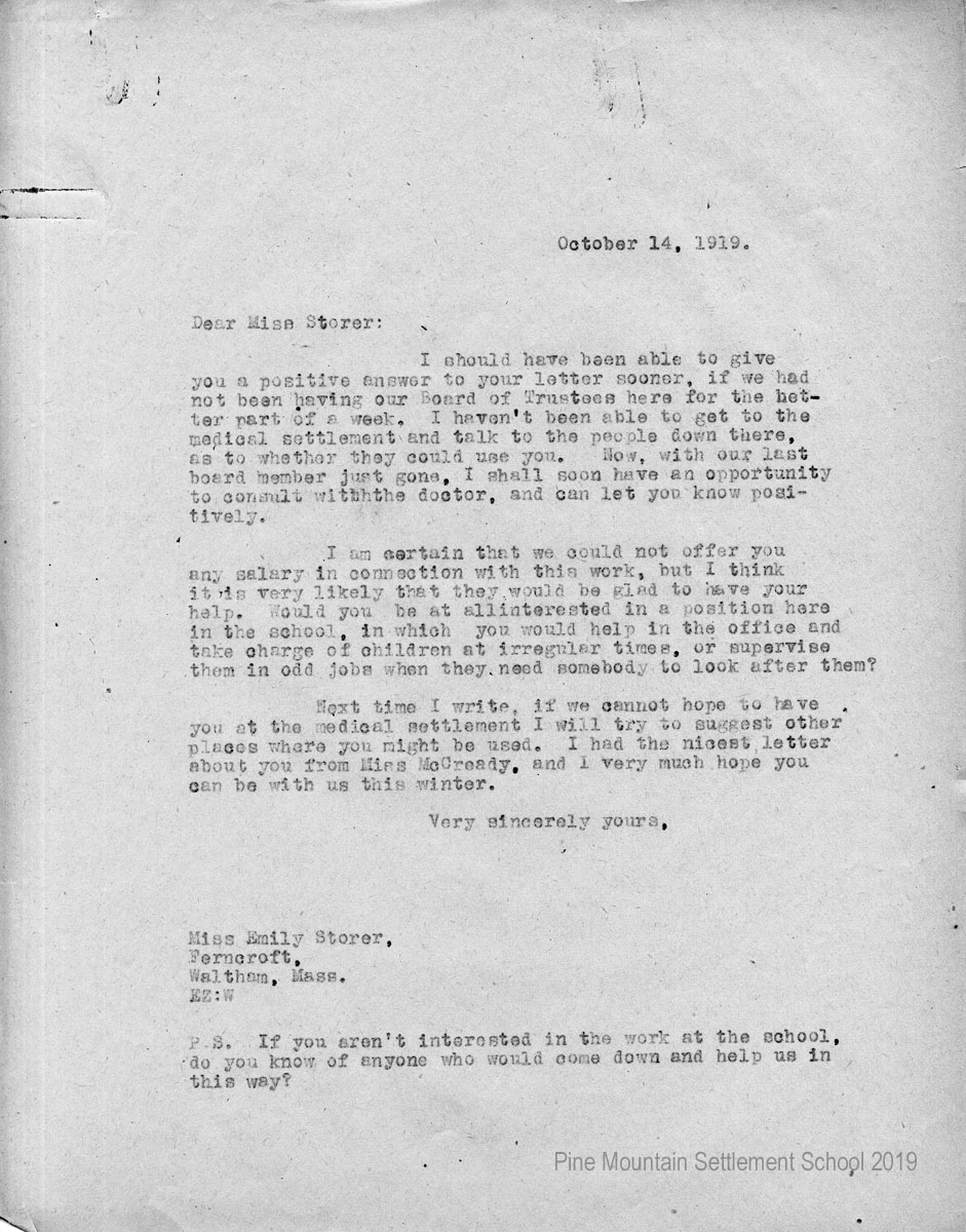 TAGS: Emily Storer Correspondence, community workers, Big Laurel Medical Settlement, job application letters, Ethel de Long Zande, train travel, donations, Playhouse fire, community, influenza, rheumatic fever