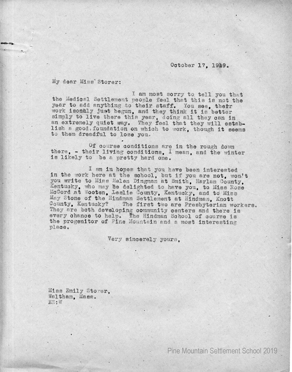 Medical Settlement does not need additional staff during their first year; recommends others to approach for employment; Helen Dingman at Smith, Harlan Co., and Rose McCord at Wooten, Leslie Co. who are Presbyterian workers developing community centers; May Stone at Hindman Settlement School, Knott Co. (“progenitor of Pine Mountain”).