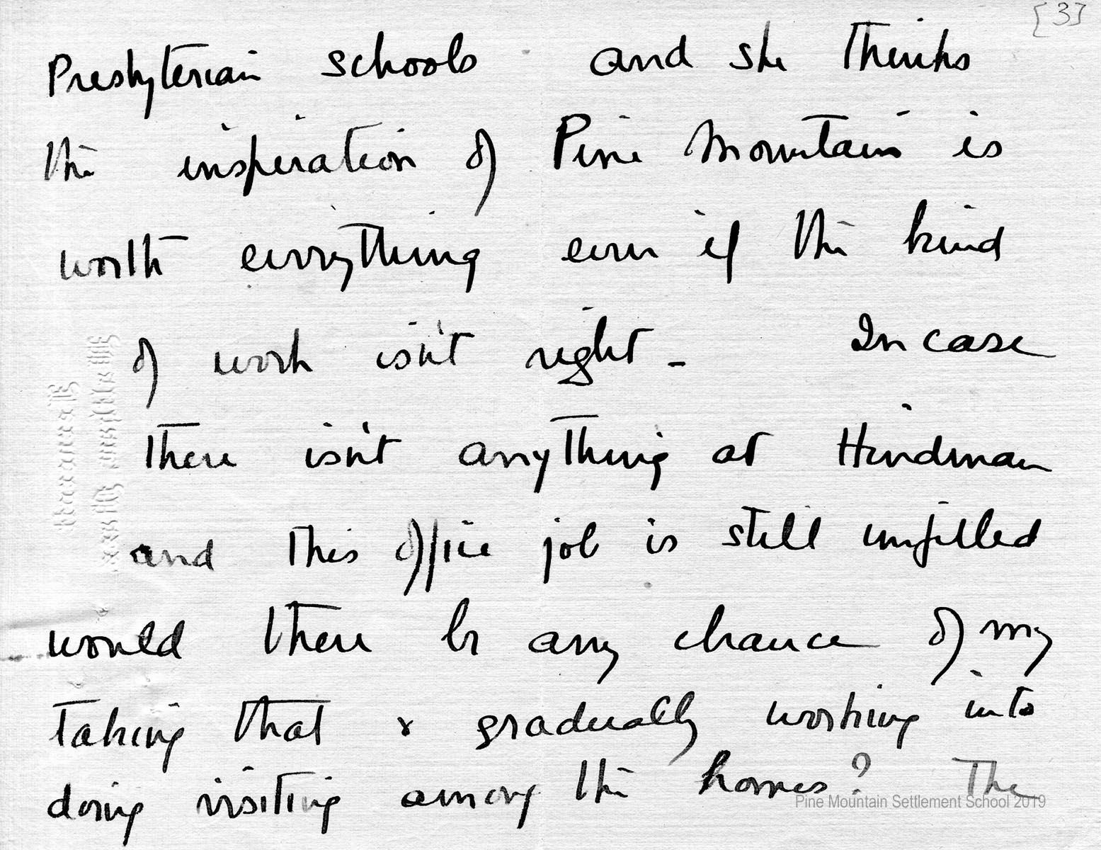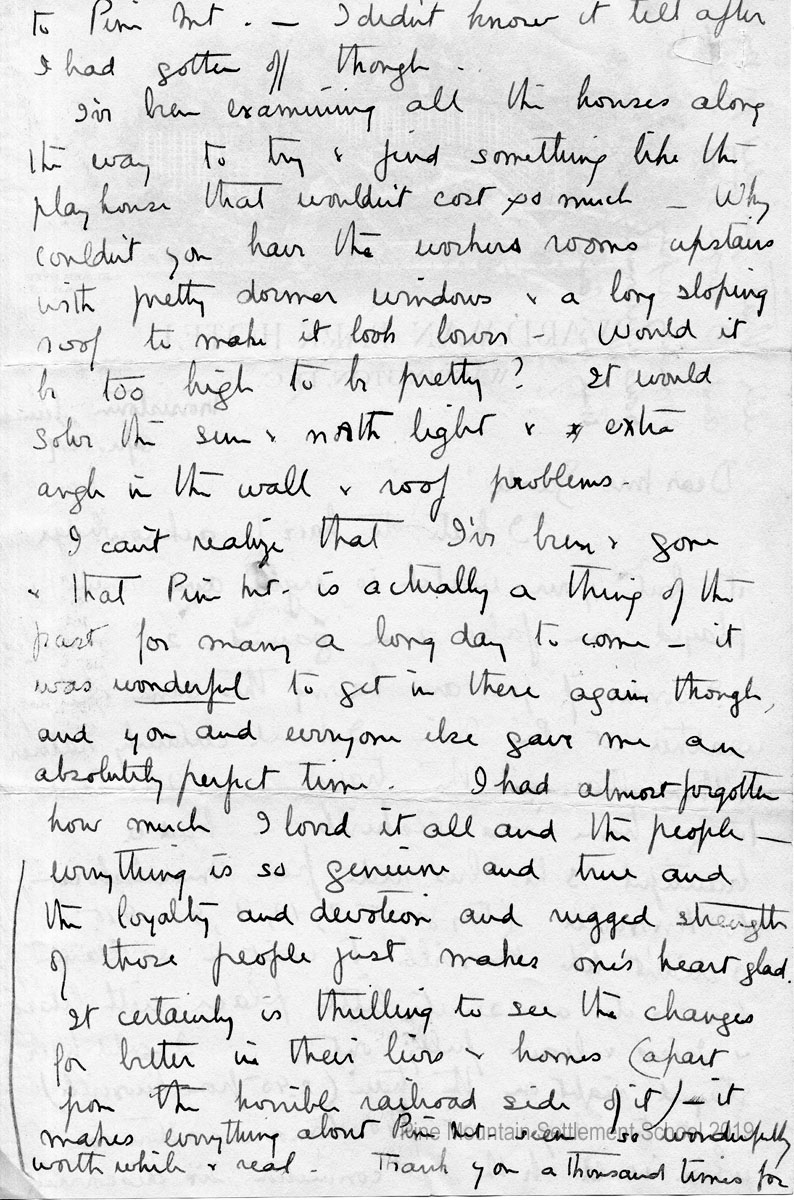 “I had almost forgotten how much I loved it all and the people. Everything is so genuine and true and the loyalty and devotion and ruggest strength of those people just makes one’s heart glad. It certainly is thrilling to see the changes for better in their lives and homes (apart from the horrible railroad side of it). It makes everything about Pine Mt. seem so wonderfully worthwhile and real.”