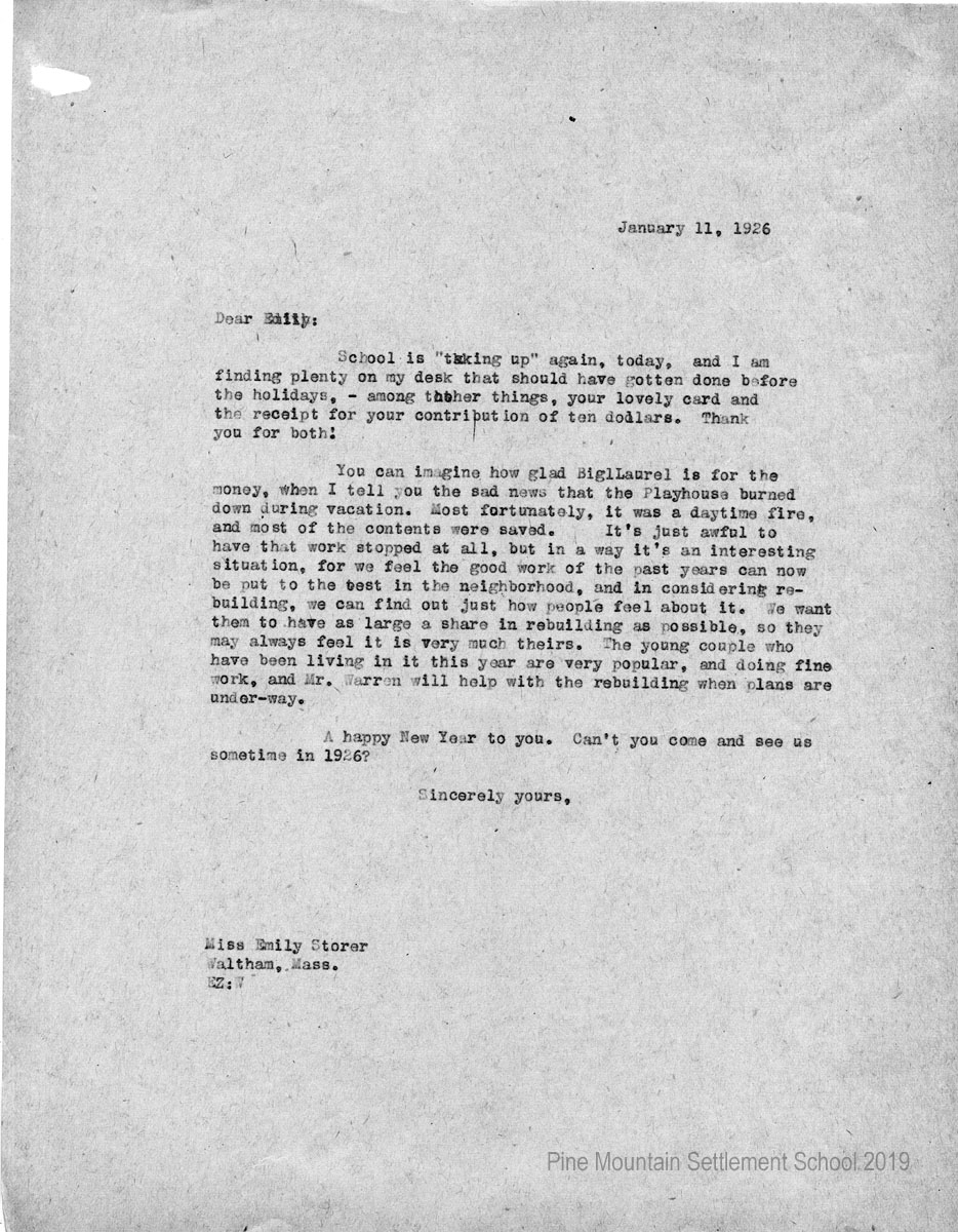 Thanks Storer for $10 donation for Big Laurel; Playhouse burned down during vacation, a test of the community’s desire to rebuild; Mr. Warren, who lived there with Mrs. Warren, will help.