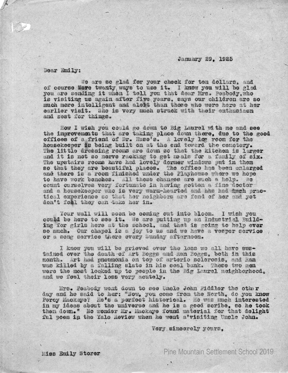 Appreciates $10 check; Mrs. Peabody visits; building improvements at Big Laurel due to Dr. Huse; an Industrial Building for girls is under construction; Chapel; Art Boggs and Ran Boggs died; Uncle John Fiddler; Percy MacKaye’s poem in the Yale Review.