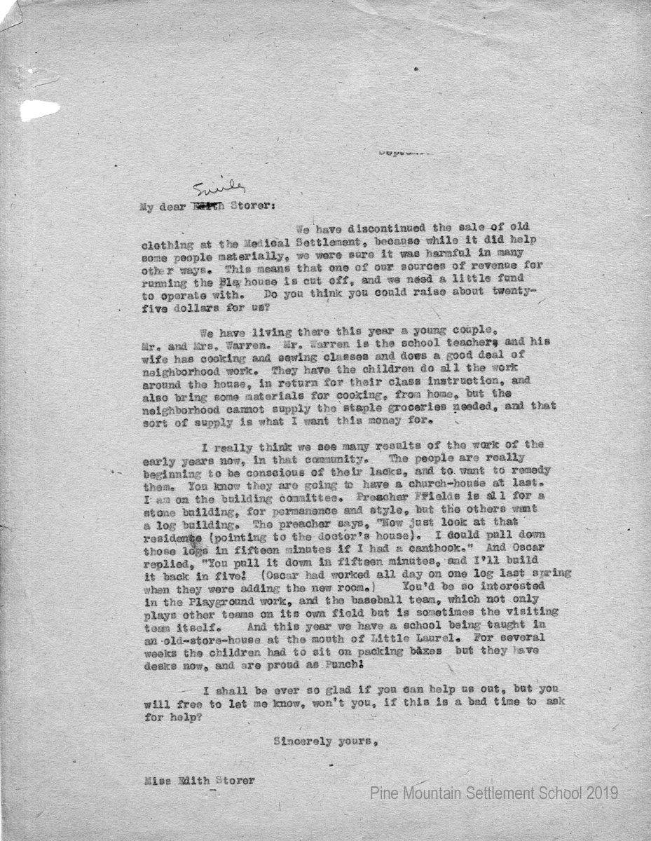 Sale of old clothing at the Medical Settlement was “harmful in many ways” and thus discontinued, so the source of revenue for Playhouse is cut off; asks Storer to raise about $25 for staple groceries. Mr. and Mrs. Warren living and working at Medical Settlement this year; updates concerning community activities, Preacher Fields, playground work, baseball team, a school at mouth of Little Laurel.