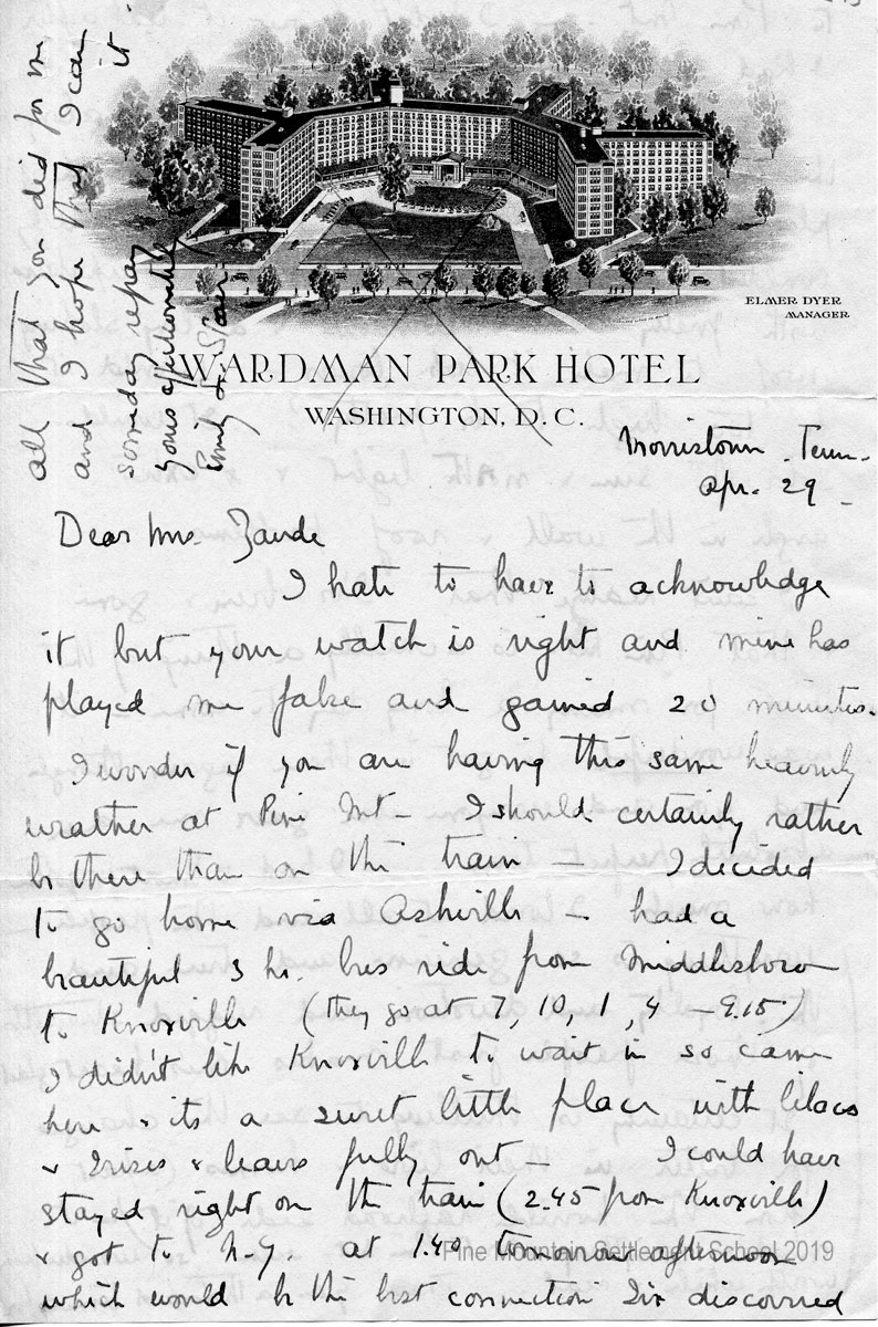 April 29, [1926]. To Zande from Storer in Morristown, TN.