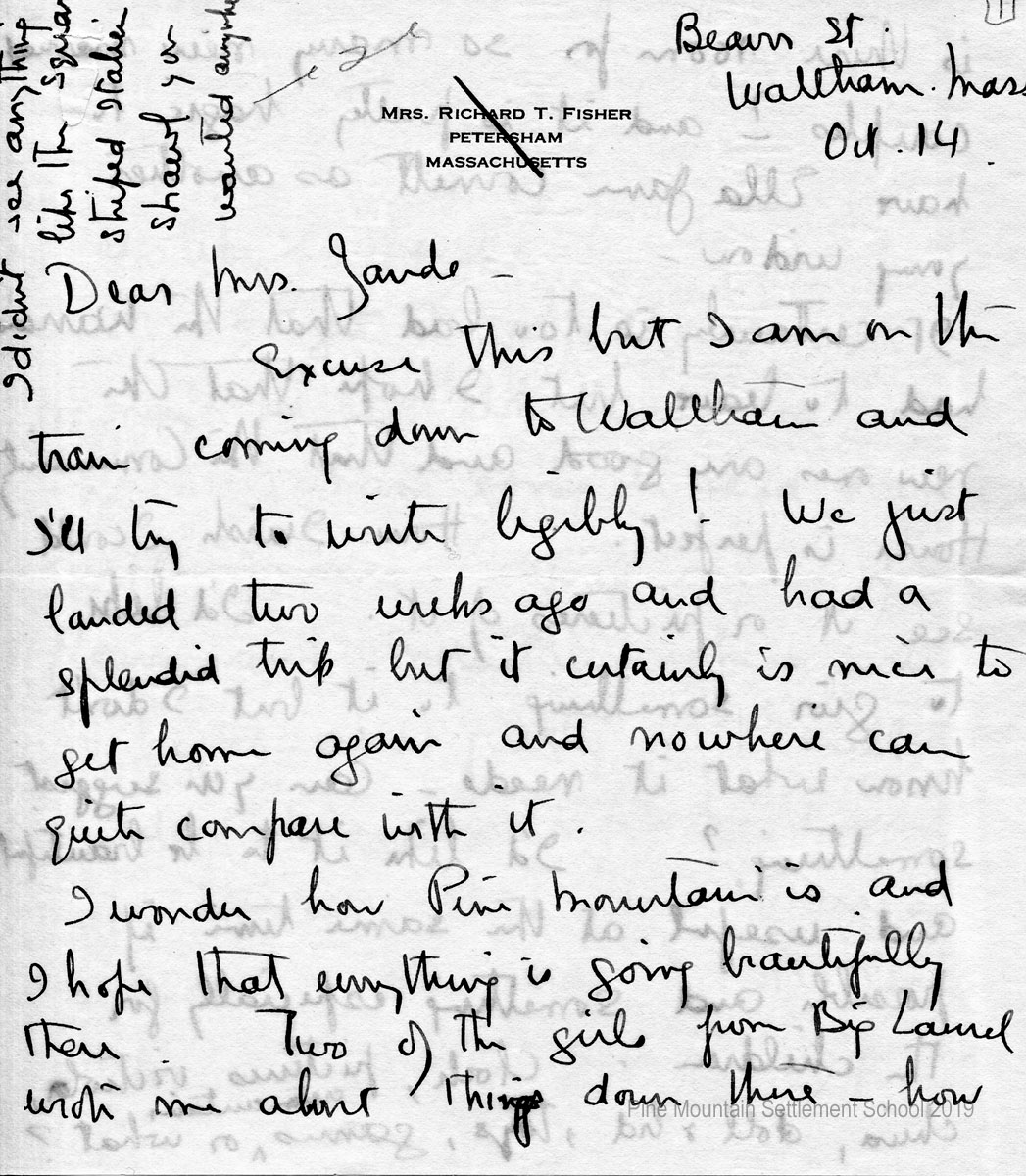 Appreciates the $10, which will go to Playhouse; Dr. Withington and Mrs. Alderman will send Christmas things; mentions Storer’s West Indian cruise plans; news from Big Laurel about Priscilla Boggs, Manilla, Floyd Smith’s shooting of Turner Turner (sic) leaving Reny with 5 daughters to support; Mrs. Creech will help her. Updates about Gilles Turner, Lewis children, Robert Harris, Bertha Turner, and Georgie Harris. Squire Creech bought the Deschamps house & Alberta and William are PMSS students. The Deschamps family are in Nashville where Mr. Deschamps is studying for a college degree and teaching.