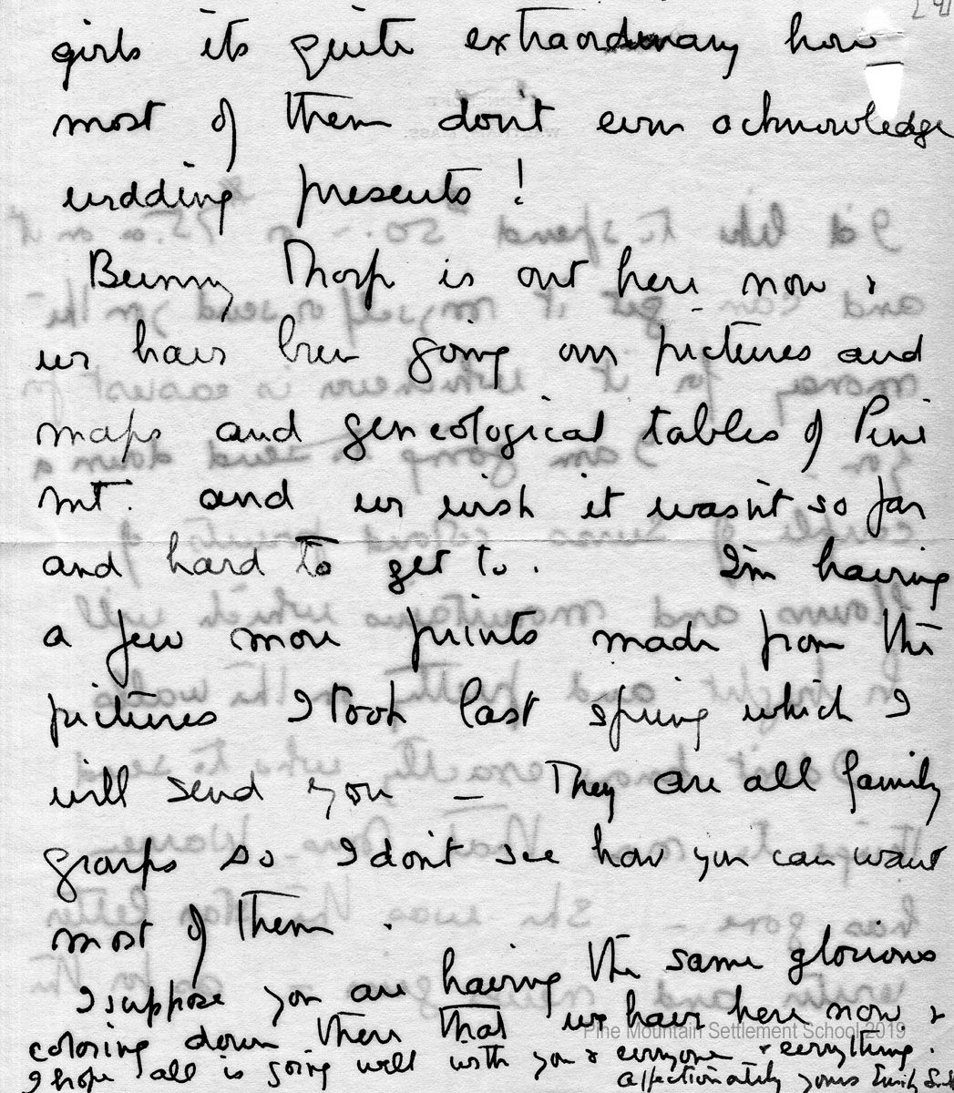 Has returned from a two-week trip; asks about PMSS. Mentions news about Ella Jane Cornett, “another young widow”; Warrens leaving PMSS; offers to give something to the Community House; sending Swiss-colored prints of flowers and mountains. Bunny Thorp is visiting and they are going over PMSS memorabilia; will send copies of photos of her PMSS visit, all family groups.