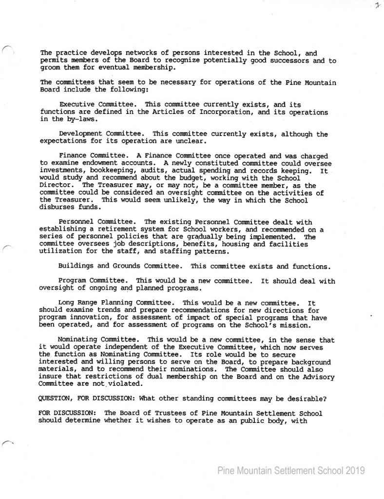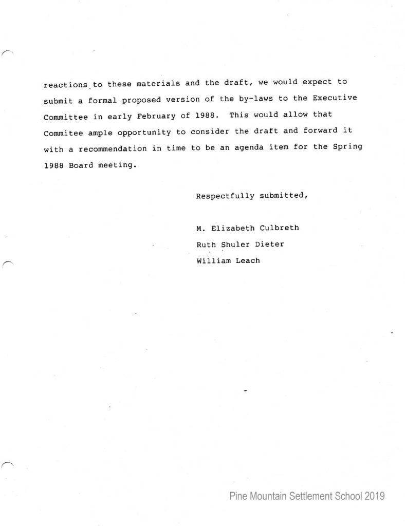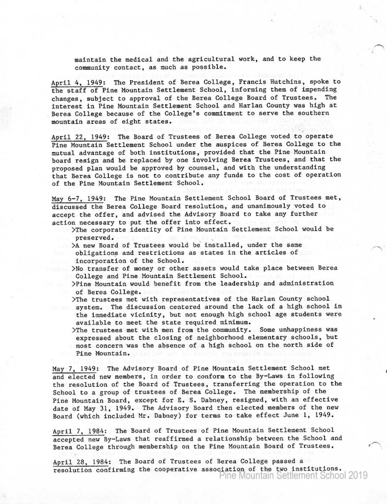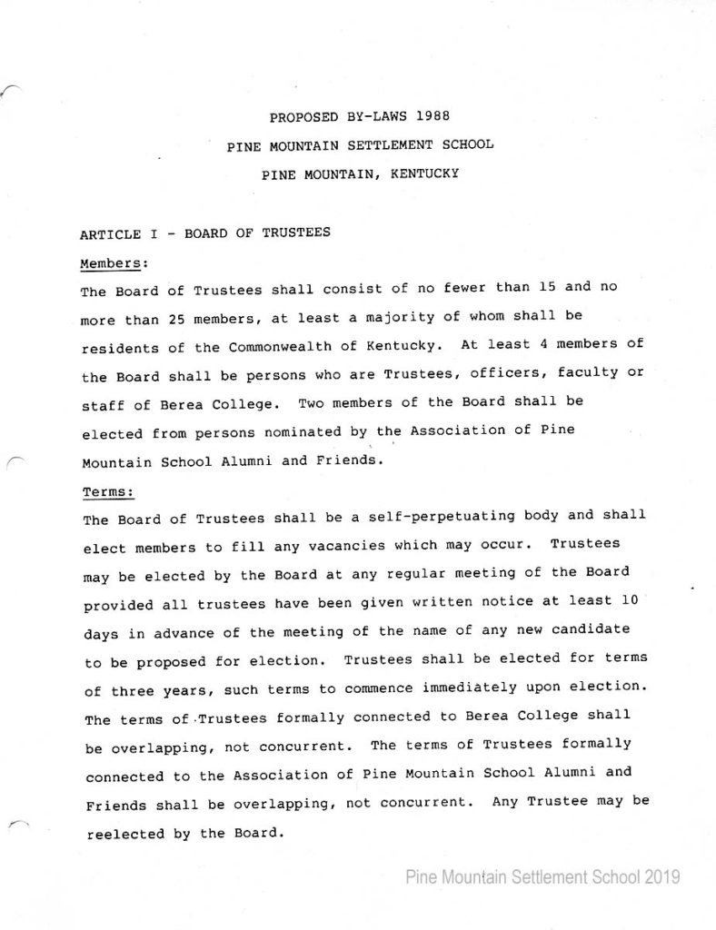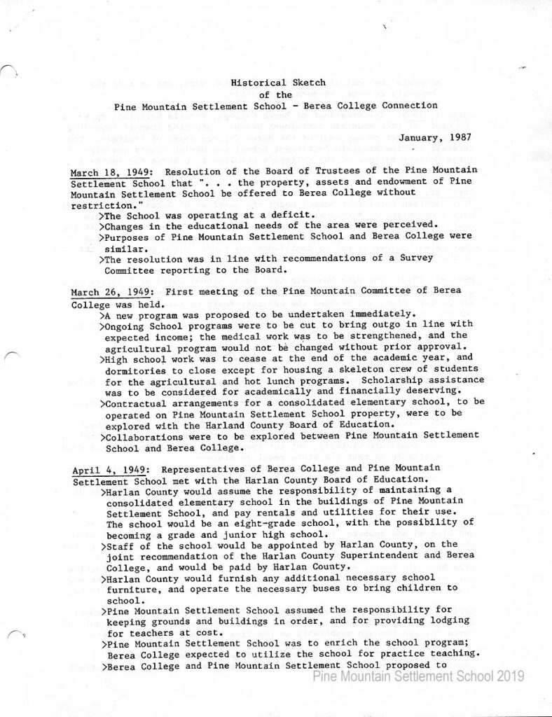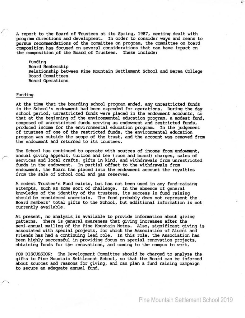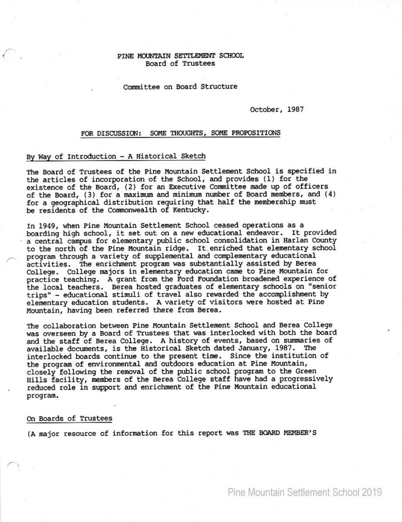 In 1987 the Board of Trustees at Pine Mountain Settlement School successfully attempted to re-structure the Board. The following is their report with accompanying documents related to their Berea College affiliation.