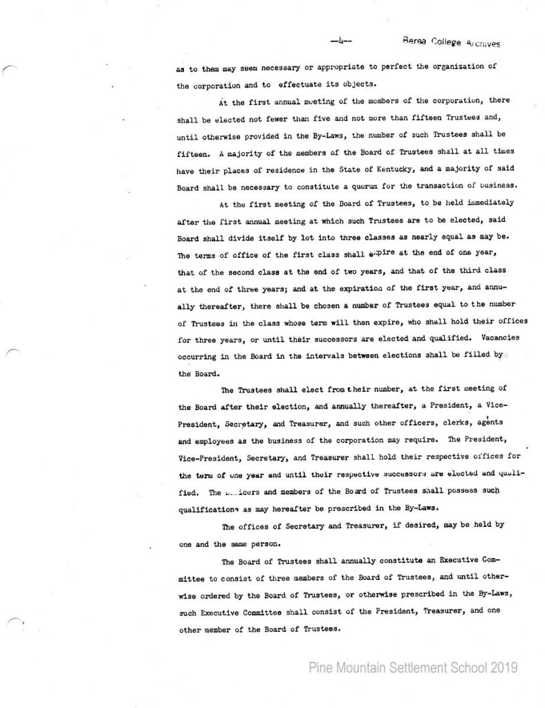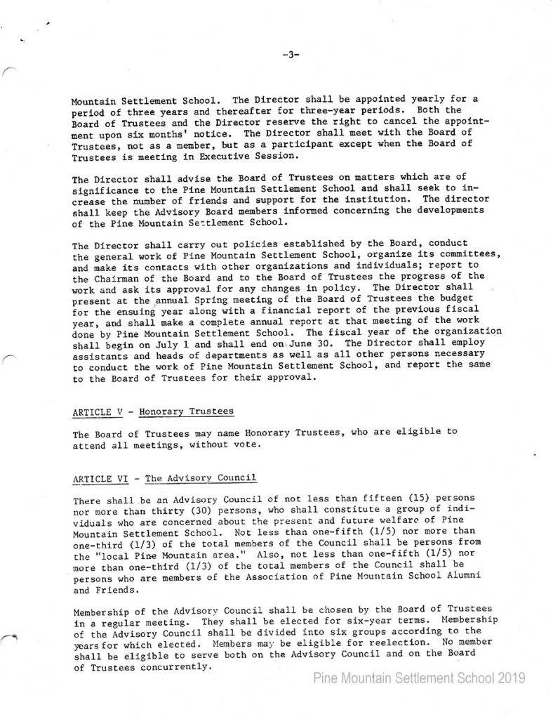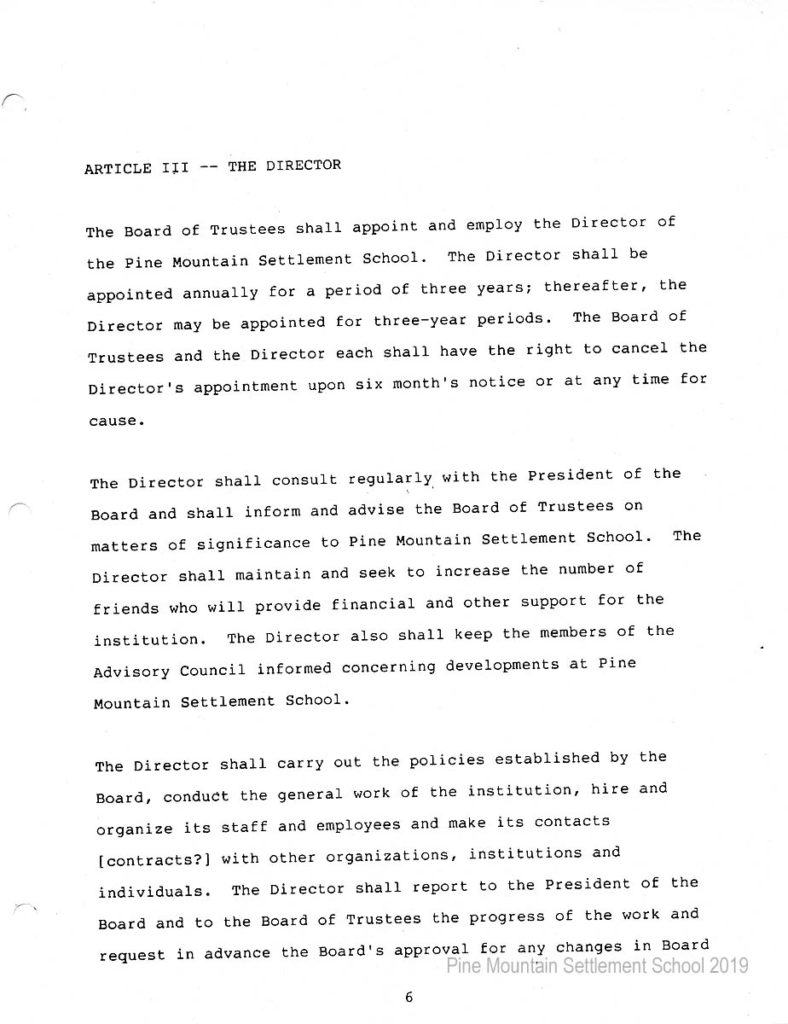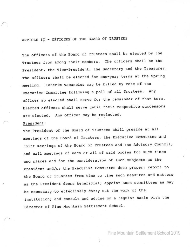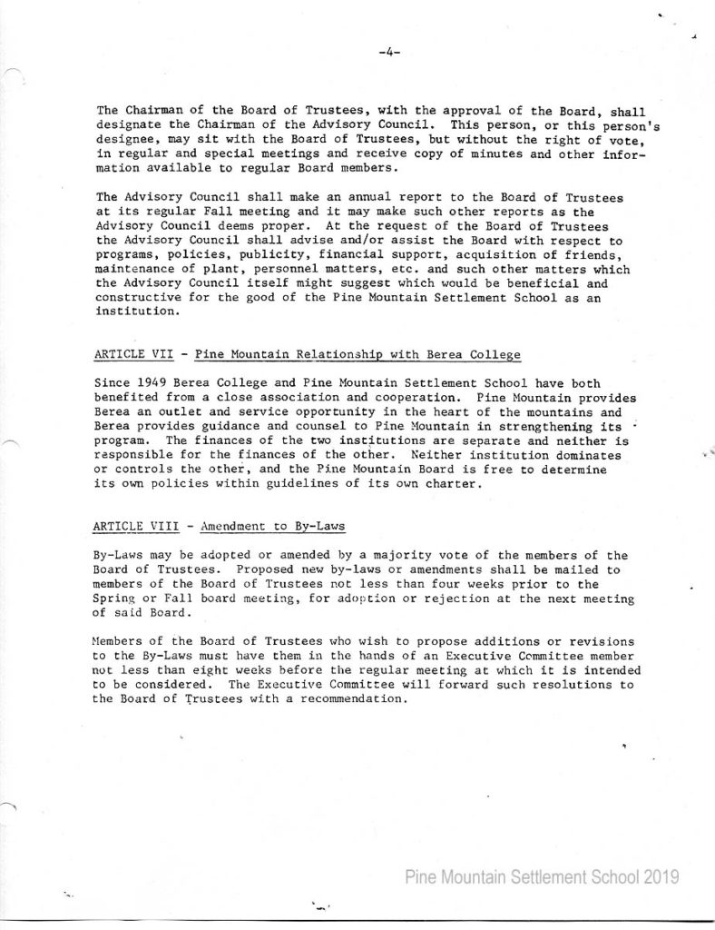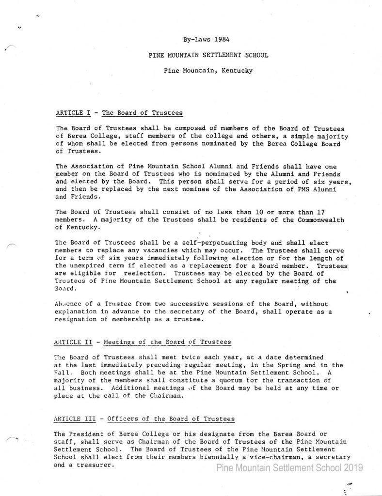 In 1987 the Board of Trustees at Pine Mountain Settlement School successfully attempted to re-structure the Board. The following is their report with accompanying documents related to their Berea College affiliation.