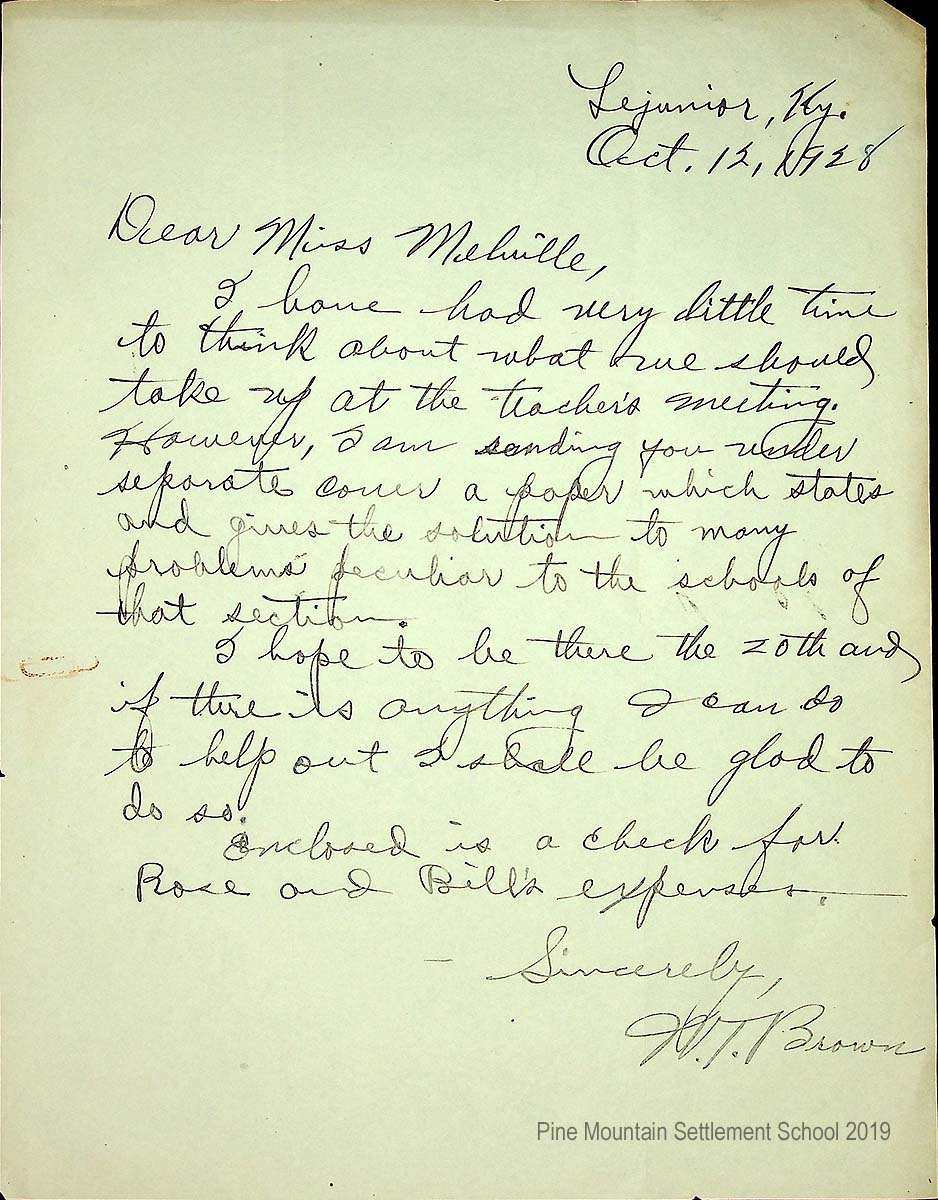 [016] October 12, 1928. Handwritten letter to Miss (Angela) Melville from W.T. Brown at Lejunior, KY, who mentions the teacher’s meeting and is sending “a paper which states and gives the solution to many problems peculiar to the schools of that section. I hope to be there [on] the 20th…. Enclosed is a check for Rose and Bill’s expenses.”