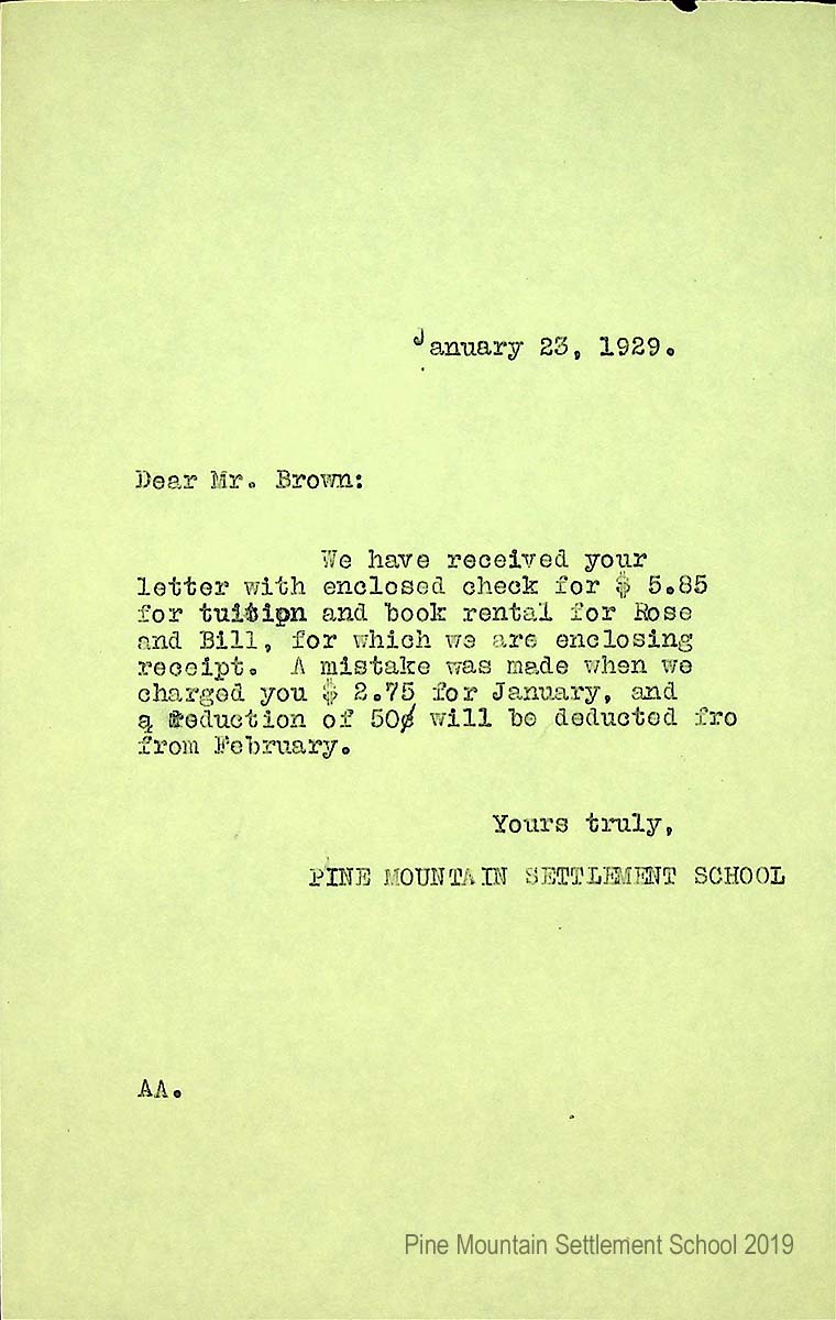 [017] January 23, 1929. To W.T. Brown from AA [unsigned], Pine Mountain Settlement School, acknowledging his check.