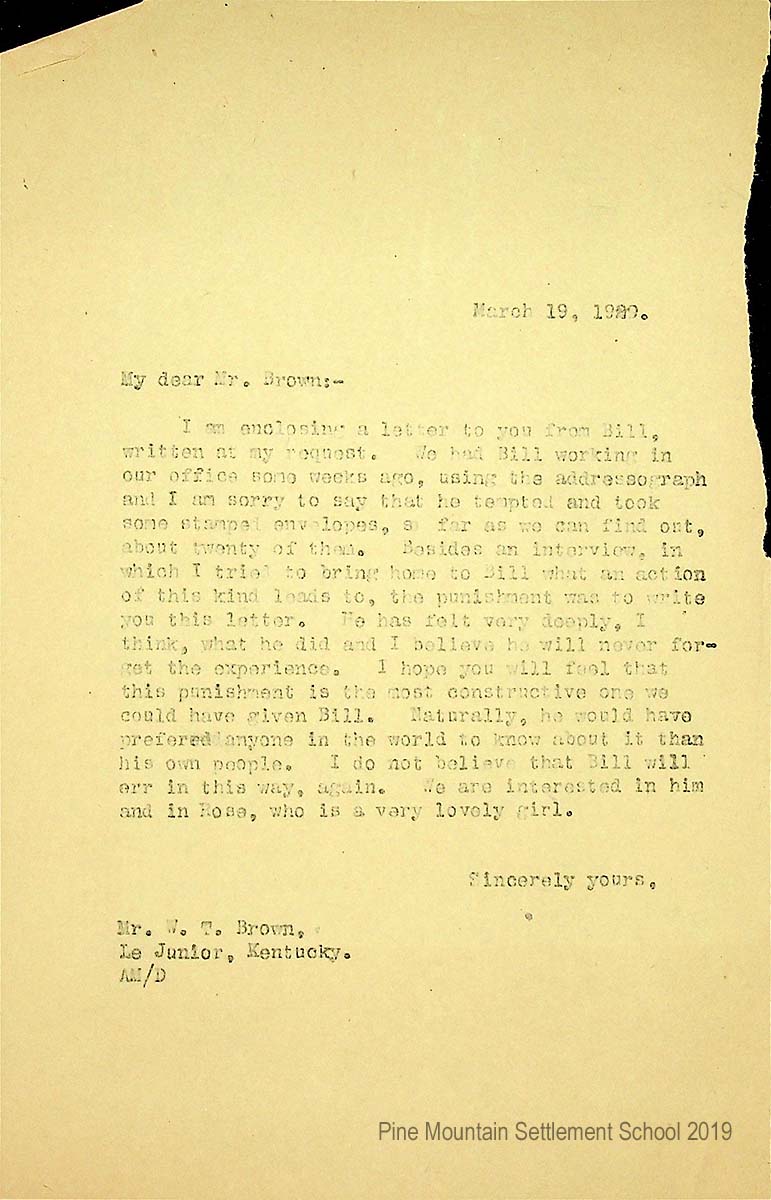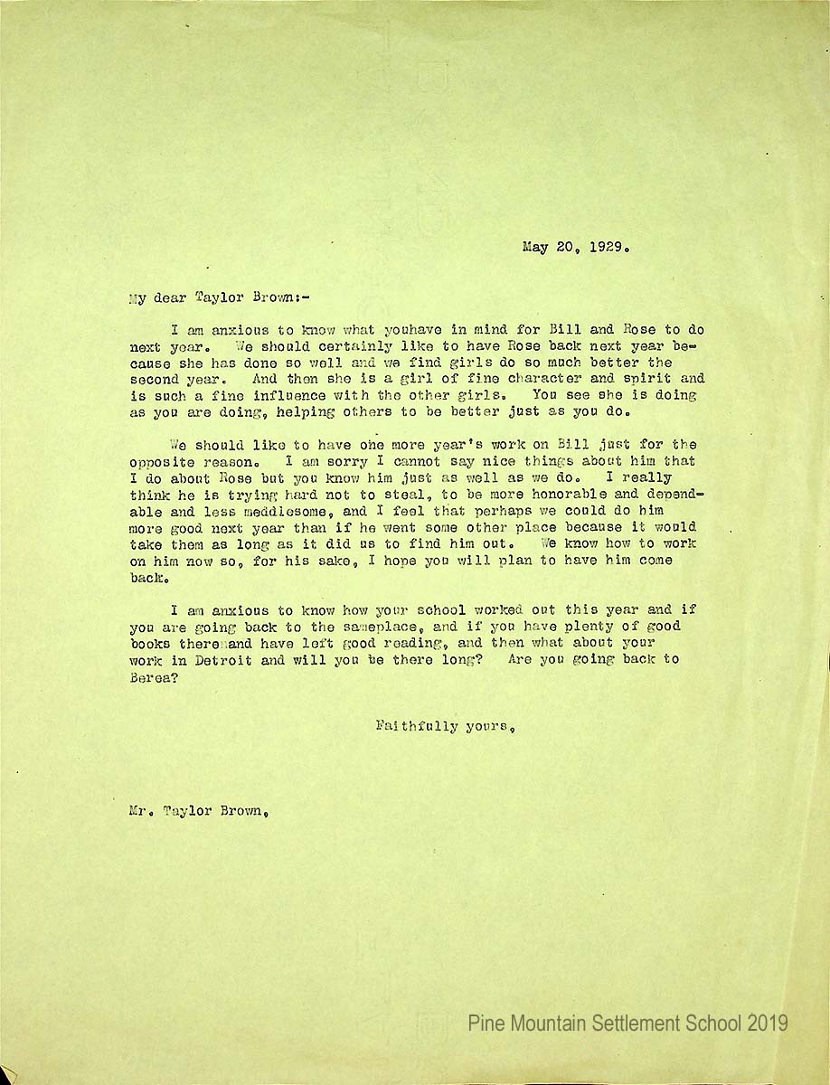 [021] May 20, 1929. To “My dear Taylor Brown” from [unsigned, apparently Pettit], asking what he plans for Bill and Rose next year. Explains why the School would like Rose and Bill to return. “[Rose] has done so well and we find girls do so much better the second year. And then she is a girl of fine character and spirit and is such a fine influence with the other girls. You see she is doing as you are doing, helping others to be better just as you do.” Bill is trying to improve his behavior and “perhaps we could do him more good next year than if he went some other place….”