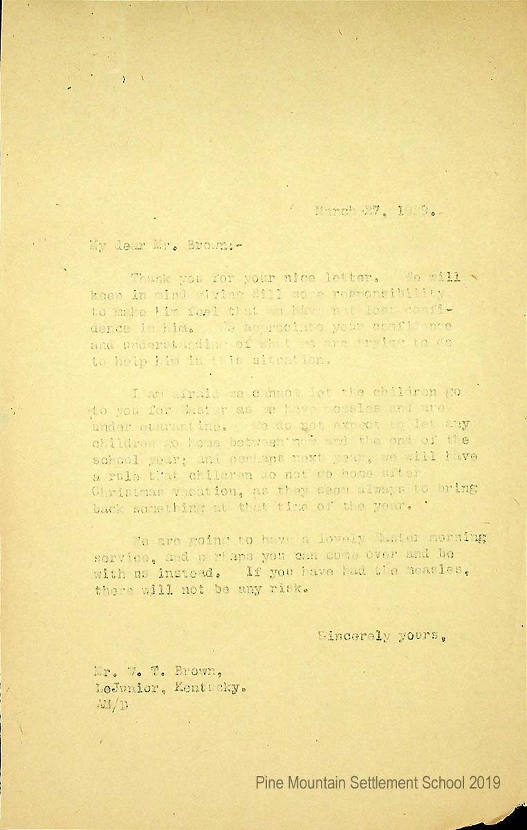 [020] March 27, 1929. To W.T. Brown from AM (Melville), thanking him for his letter and telling him how PMSS will follow up on his suggestions. The School cannot let Bill and Rose go with him for Easter as the PMSS students are under a measles quarantine through Christmas. Invites him to the Easter morning service, if he has already had the measles.