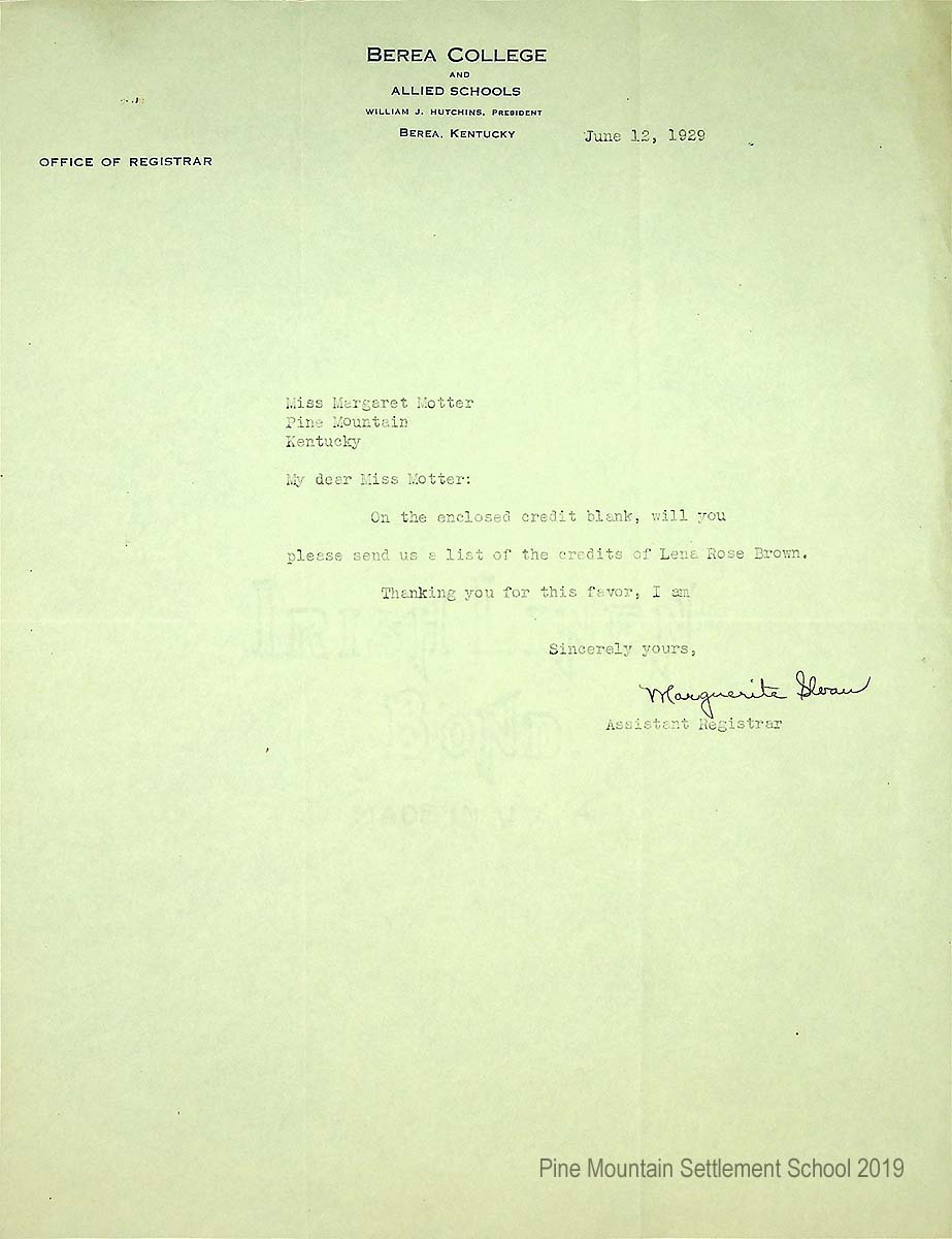 [022] June 12, 1929. To Miss Margaret Motter from Marguerite Sloan, Assistant Registrar at Berea (KY) College, requesting a list of the credits of “Lena Rose Brown.”