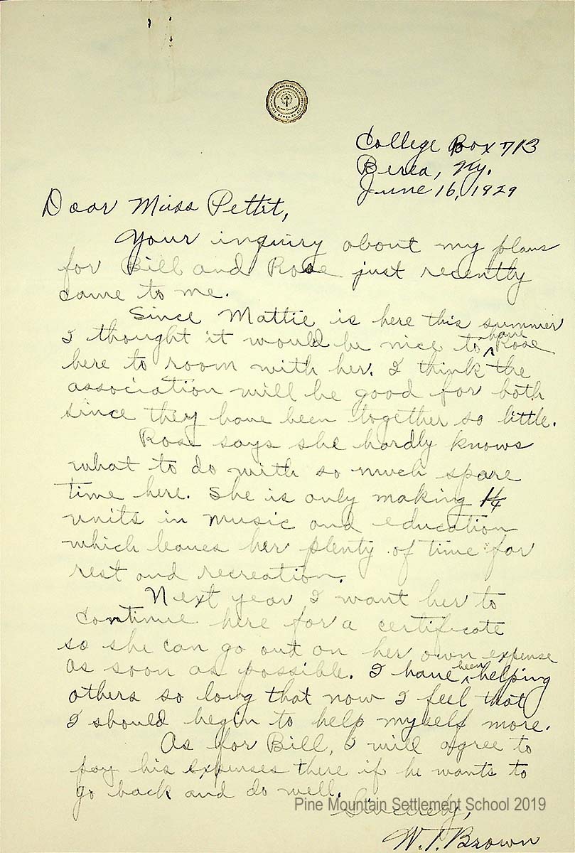 [023], [024] June 16, 1929. Two-page handwritten letter to Miss Pettit from W.T. Brown in Berea, Ky., [023] answering Pettit’s “inquiry about my plans for Bill and Rose. … Since Mattie is here this summer I thought it would be nice to have Rose here to room with her. I think the association will be good for both since they have been together so little.” Tells about Rose’ s time in Berea, having only taken a few units in music and education. “Next year I want her to continue here for a certificate so she can go out on her own expense as soon as possible. I have been helping others so long that now I feel that I should begin to help myself more. As for Bill, I will agree to pay his expenses there if he wants to go back and do well.”