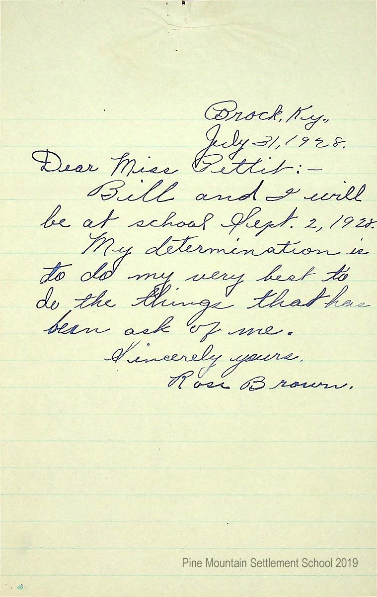 [014] August 17, 1928. Handwritten letter to Miss Pettit from W.T. (Taylor) Brown, Berea, KY, describing his arrangements to bring Rose and Bill to PMSS on his way to Harlan to teach. “The parents have agreed for Rose to go but not Bill. However, when I get home I think I can change their minds. I am anxious to see your school again.”