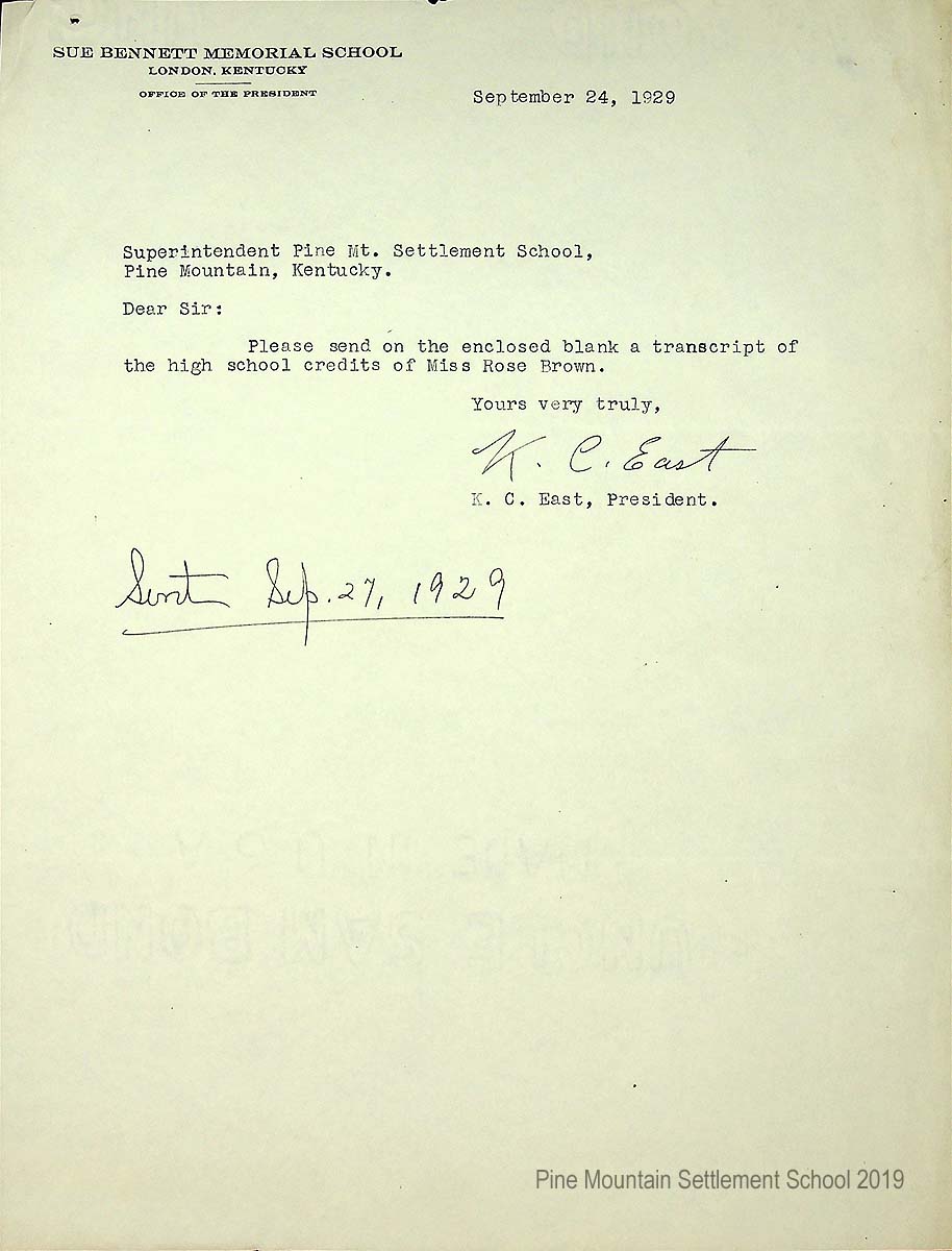 [027] September 24, 1929. Typewritten letter to “Superintendent, Pine Mt. Settlement School” from K.C. East, President, Sue Bennett Memorial School, London, KY, asking for “a transcript of the high school credits of Miss Rose Brown.” Handwritten notation; “Sent Sep. 27, 1929.”