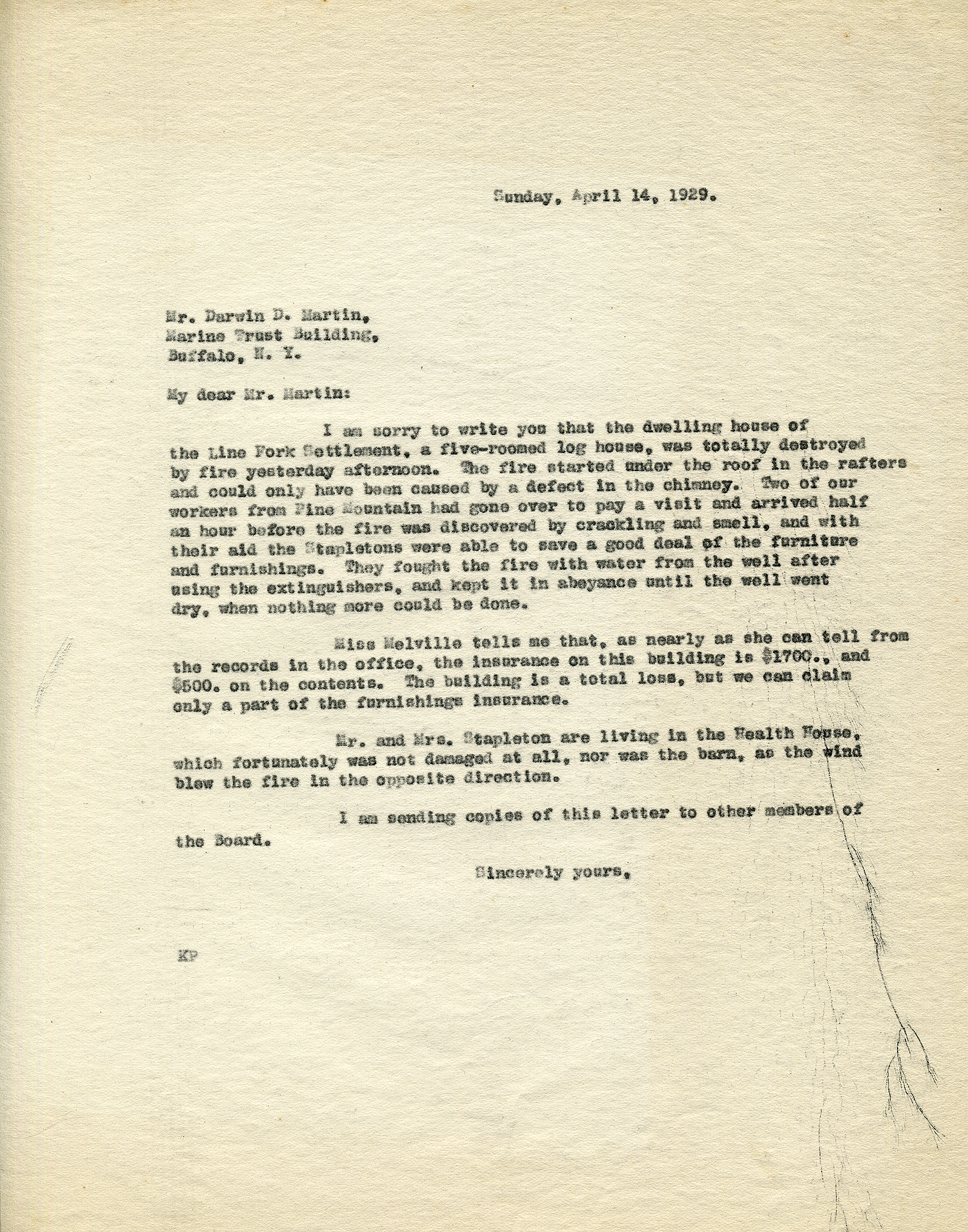 lin_frk_bldg_032.jpg  and lin_frk_bldg_033.jpg – Carbon copy of typewritten letter from [unsigned, probably Robert Stapleton[ to Darwin D. Martin, dated June 14, 1929; 2 pages. The letter is written in response to Mr. Martin’s letter to Miss Pettit. The writer describes the plan now in use and progress of the construction. The writer answers Mr. Martin’s question concerning the greater amount of medical work at Big Laurel Settlement than at Line Fork.