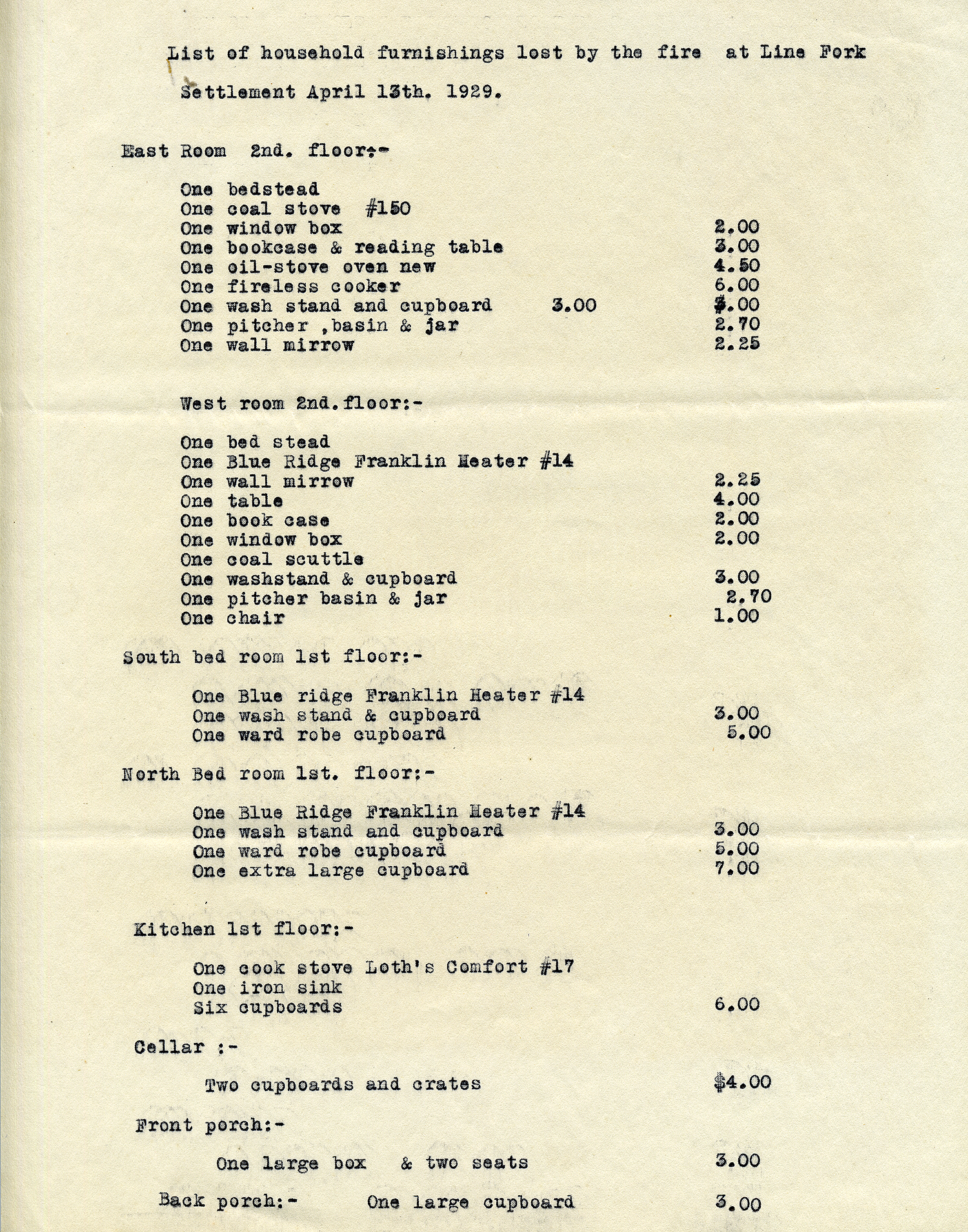List of household furnishings lost by the fire at Line Fork Settlement, April 13, 1929
