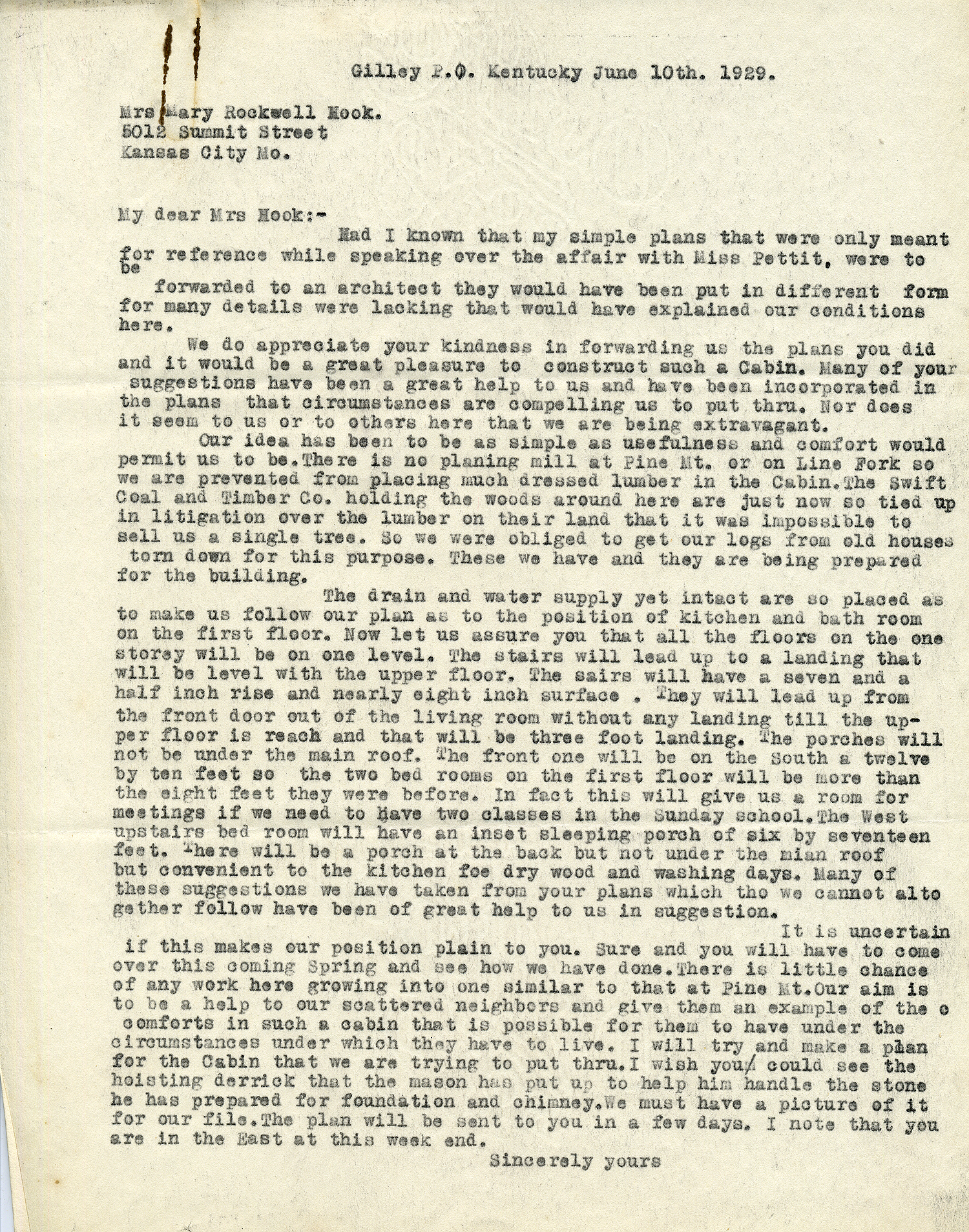 MARY ROCKWELL HOOK Correspondence 1929 Line Fork Architectural Planning Cabin 2