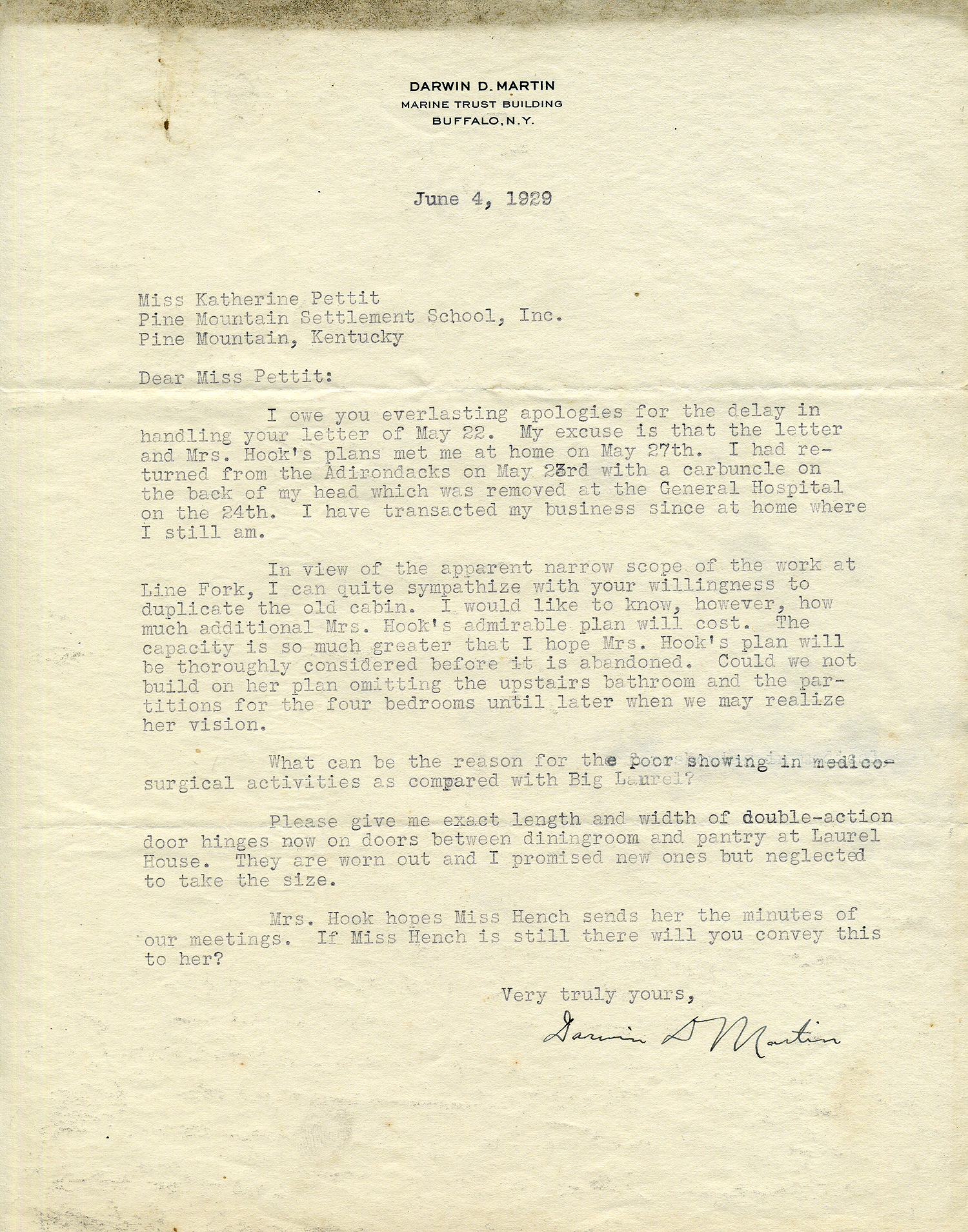 line_frk_bldg_031.jpg – Original typewritten letter from Darwin D. Martin to Katherine Pettit, dated June 4, 1929; 1 page. Mr. Martin asks Miss Pettit to carefully consider Mrs. Hook’s plans for the Line Fork cabin before abandoning them.