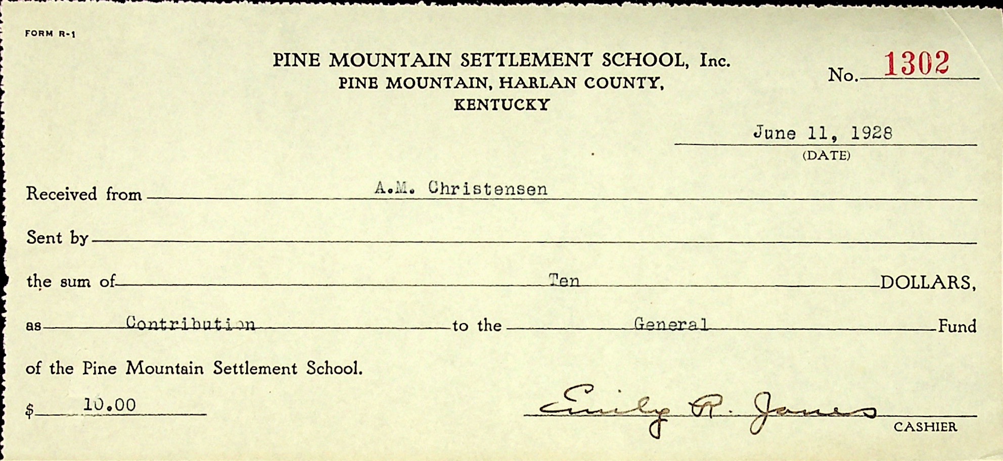 christensen_1928-06-11. June 11, 1928. Receipt for donation from Mrs. A.W. Christensen.