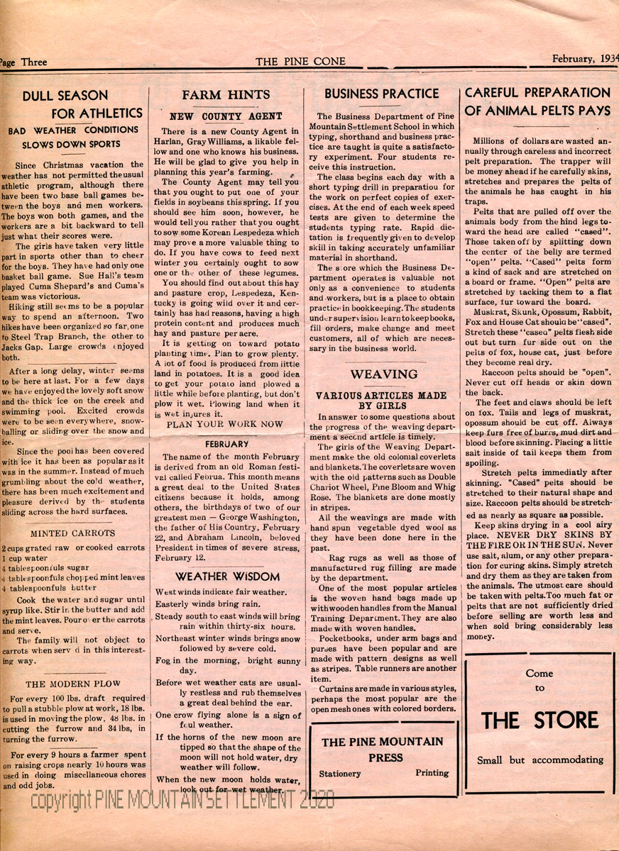 “Pine Mountain Institutes New Free Time Program: School Activities on College Basis” ; students’ leisure time ; study hours ; class periods ; privileges for honor roll students ; exemptions from class attendance ; Miss Frank, Principal ; new literary magazine ; graduation costumes ; weaving now available for both Jr. and Sr. H.S. girls ; Spring operetta ; “The Mikado” ; spring plowing ; hot beds ; drainage ditches ; Memorial Vesper service for Miss Bessie Wallace, former PMSS worker ; Dr. Newman arrival Jan 7th ; tuberculosis patient ; Dr. Newman’s educational background ; Valentine Party at Laurel House ; dancing ; Peggy McIntyre, student from Jeff, had appendectomy operation ; Egre Manning, former PMSS graduate, studying dairying and farming with Mr. Mailer (former PMSS farmer) in Denmark folk school ; heating plant replaced in girls industrial building ; shower added to Farm House ; blackboards added to School House; Carvel Collins, friend of Mr. Angel from Miami Univ., visited and gave talk.