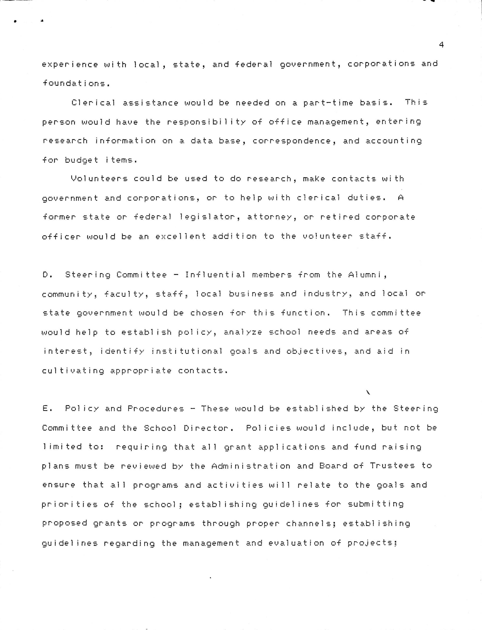 E. Policy and Procedures – These would be established by the Steering Committee and the School Director. Policies would include, but not be limited to: requiring that all grant applications and fundraising plans must be reviewed by the Administration and Board of Trustees to ensure that all programs and activities will relate to the goals and priorities of the school; establishing guidelines for submitting proposed grants or programs through proper channels; establishing guidelines regarding the management and evaluation of projects;