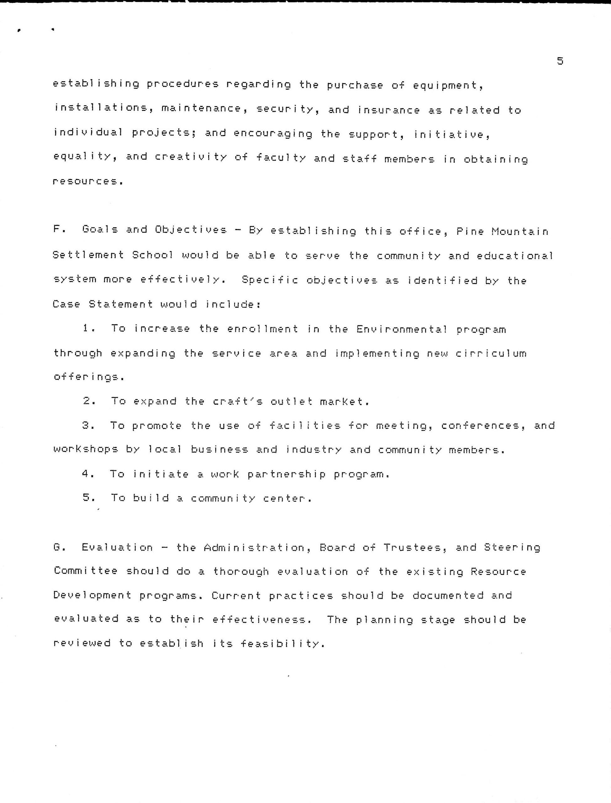 F. Goals and Objectives – By establishing this office, Pine Mountain Settlement School would be able to serve the community and educational system more effectively. Specific objectives as identified by the Case Statement would include: