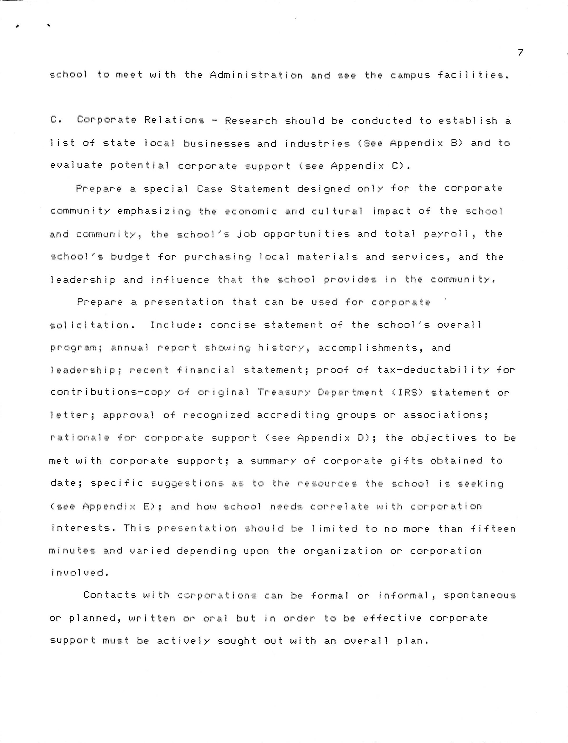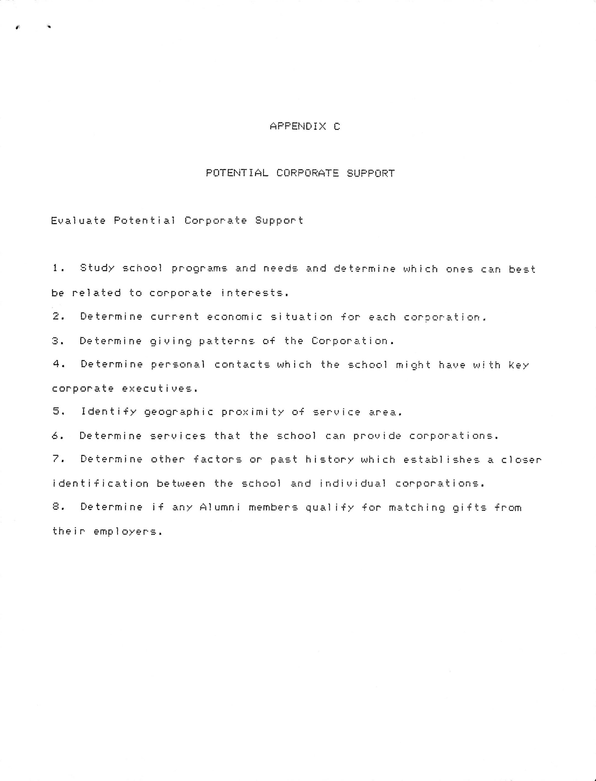 C. Corporate Relations – Research should be conducted to establish a list of state [and] local businesses and industries (See Appendix B) and to evaluate potential corporate support (see Appendix C).