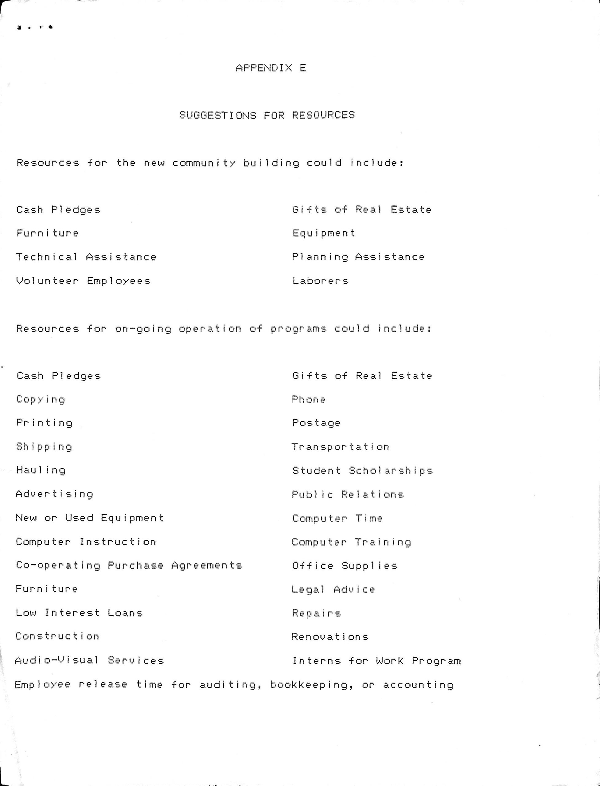 Resources for the new community building could include: