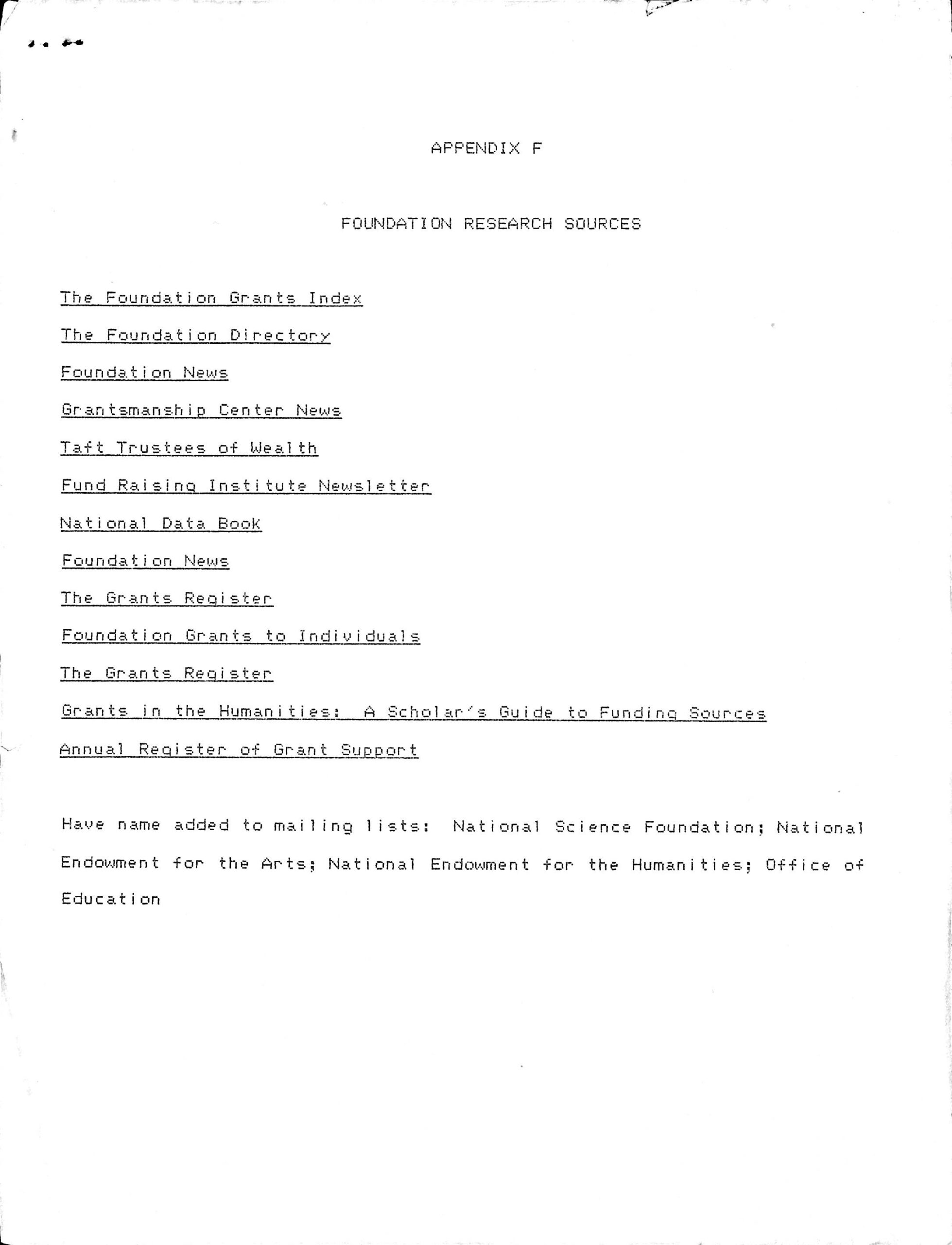Have name added to mailing lists: National Science Foundation; National Endowment for the Arts; National Endowment for the Humanities; Office of Education